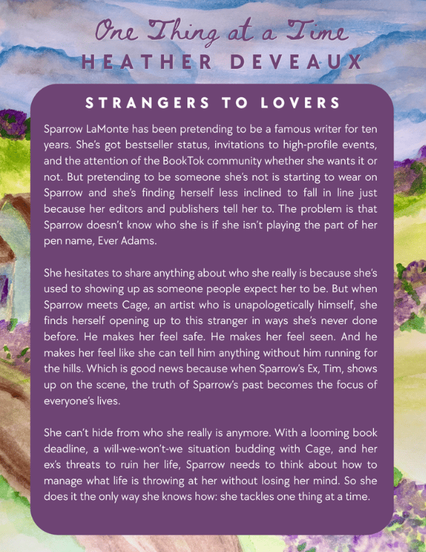 She can’t hide from who she really is anymore. With a looming book deadline, a will-we-won’t-we situation budding with Cage, and her ex’s threats to ruin her life, Sparrow needs to think about how to manage what life is throwing at her without losing her mind. So she does it the only way she knows how: she tackles one thing at a time.