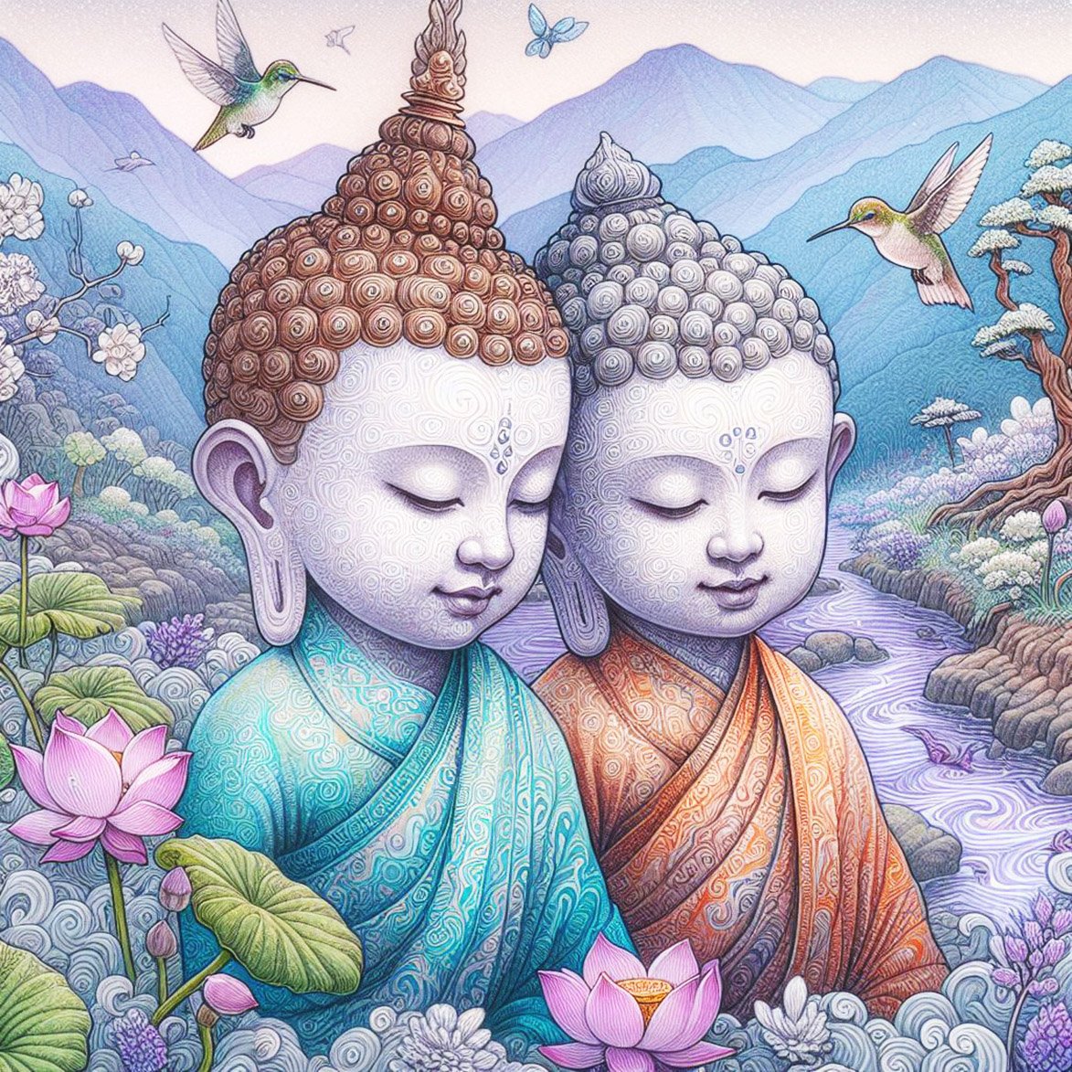 Two child buddhas wearing blue & orange robes with silver embroidered stitching & a gold & brown headpiece. They sit beside a narrow windy purple river with lotus flowers, & mountains. There are lots of white bonsai trees, humming birds fly around them & there are tall wild flowers.