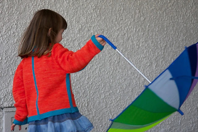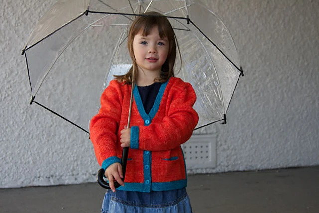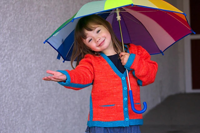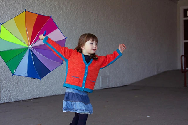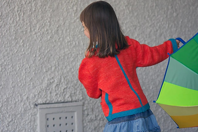 Your child might want to eat and sleep in this bright sweater. The seams are knit-in using colourful garter stitch bands and the pocket linings flash the same colour as the seams for lots of visual impact.