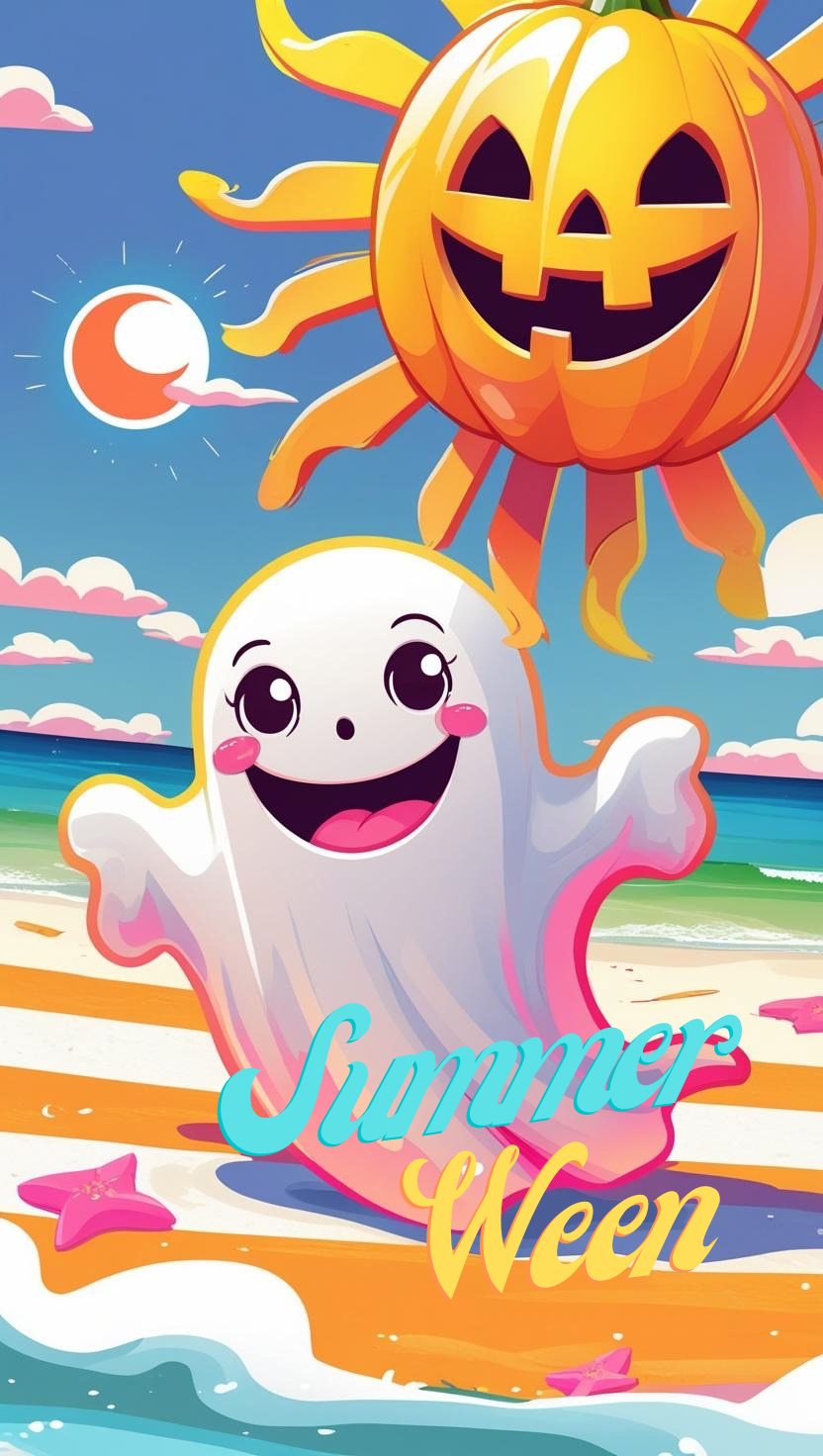Summerween Beach Ghostie Lock Screen and Wallpaper PNG for your phone! Cutie ghost and his pumpkin sun are ready to celebrate spooky Summerween! 👻☀️