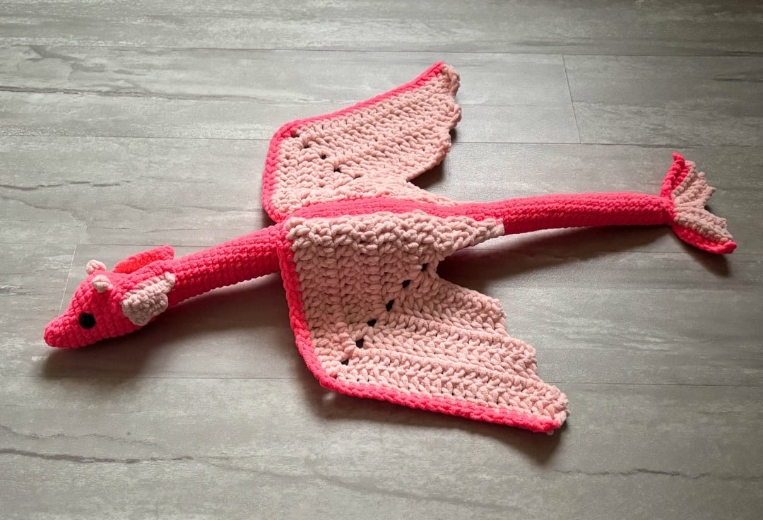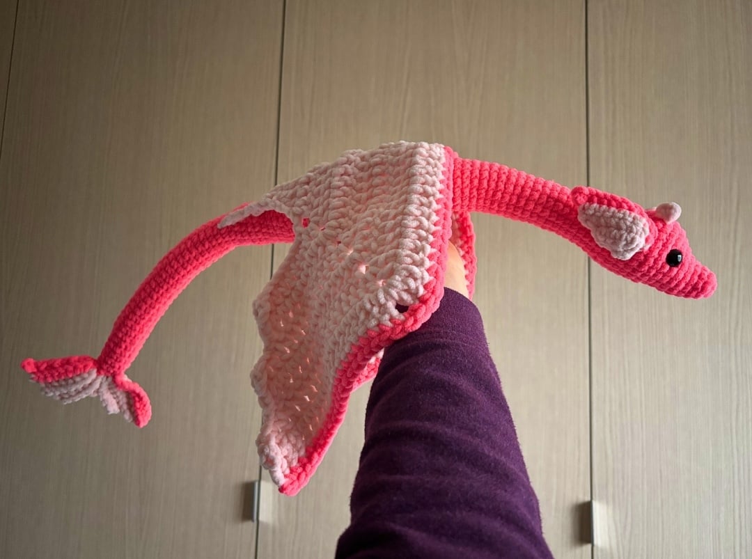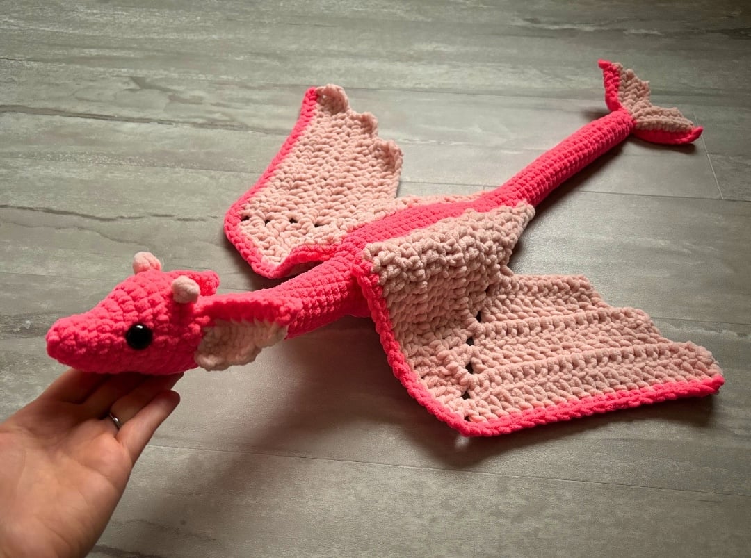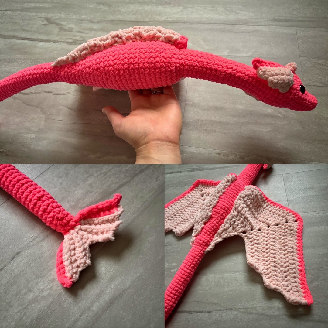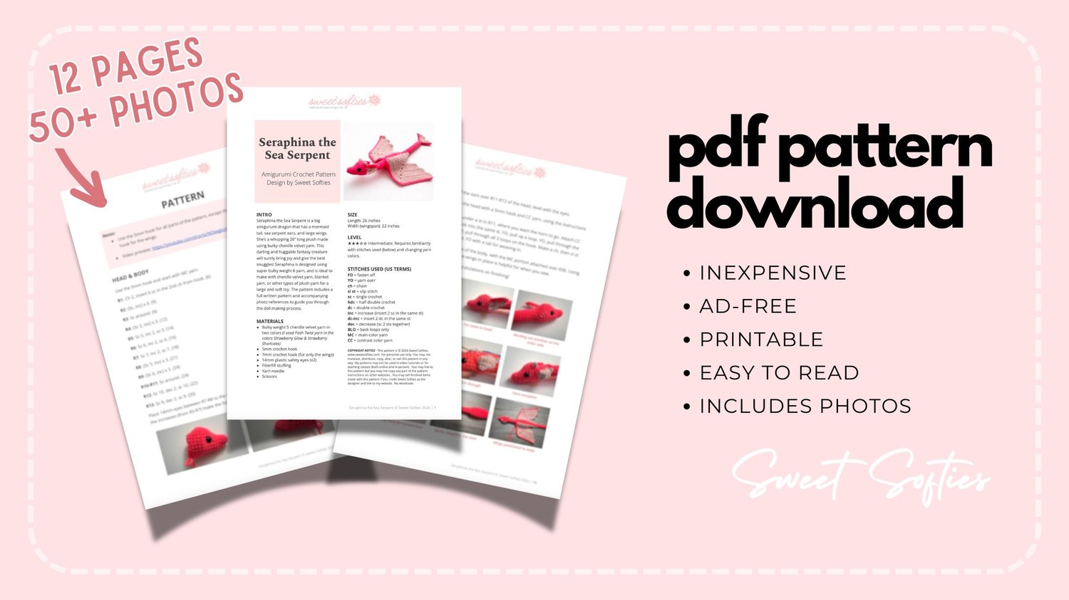 Seraphina the Sea Serpent is a big amigurumi dragon that has a mermaid tail, sea serpent ears, and large wings. She’s a whopping 26” long plush made using bulky chenille velvet yarn. This darling and huggable fantasy creature will surely bring joy and give the best snuggles! Seraphina is designed using super bulky weight 6 yarn, and is ideal to make with chenille velvet yarn, blanket yarn, or other types of plush yarn for a large and soft toy. The pattern includes a full written pattern and over 50 photo references to guide you through the doll making process.