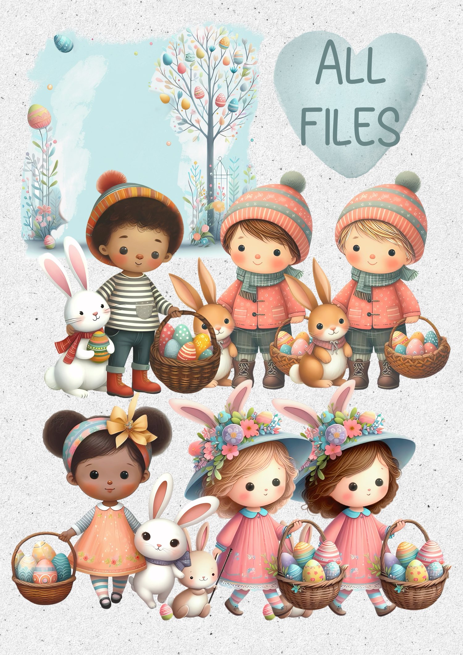 Easter girl, boy and bunny. Darker skinned versions also. 8 PNGs. Background included separately.