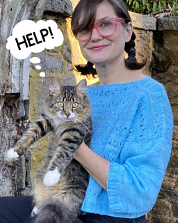 Sharon From Security also photobombed one of my photos as you can see; it seems to be the story of this sweater. She says that those are also her paw prints patterned in the sweater but she’s just making stuff up to flex on Jean from I.T. That blue sweater was made in Miss Babs Yowza DK in Chirp. Link for yarn is here or you can use the larger Yowza skeins if they work with your yardage.