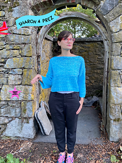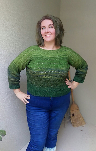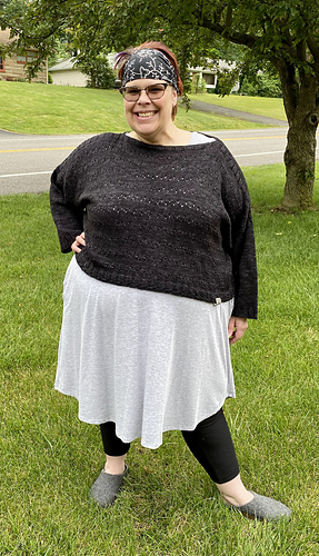 Little Lulu is like a pretty sweatshirt that you knit. Designed to be worn with 4-8” / 10-20.5 cm of positive ease and cropped. See schematic at left. Wear with yoga pants, jeans, or just underwear during your pandemic Zoom call, it is versatile.