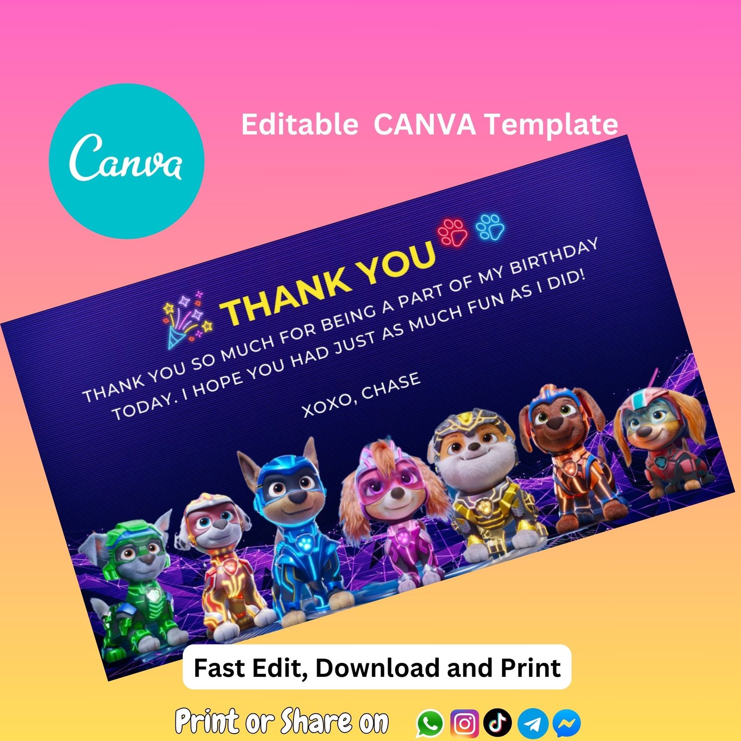 With our digital download, you can conveniently print as many copies as you need, making it ideal for parties of any size. Whether you're hosting a small gathering or a large extravaganza, our Neon Paw Patrol The mighty Movie 2023 Birthday Invitation delivers the perfect touch of whimsy and charm, setting the stage for an incredible celebration.