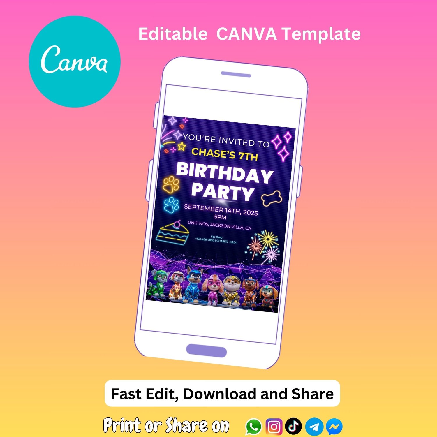 Paw Patrol Neon II Birthday Invitation Template (Printable)