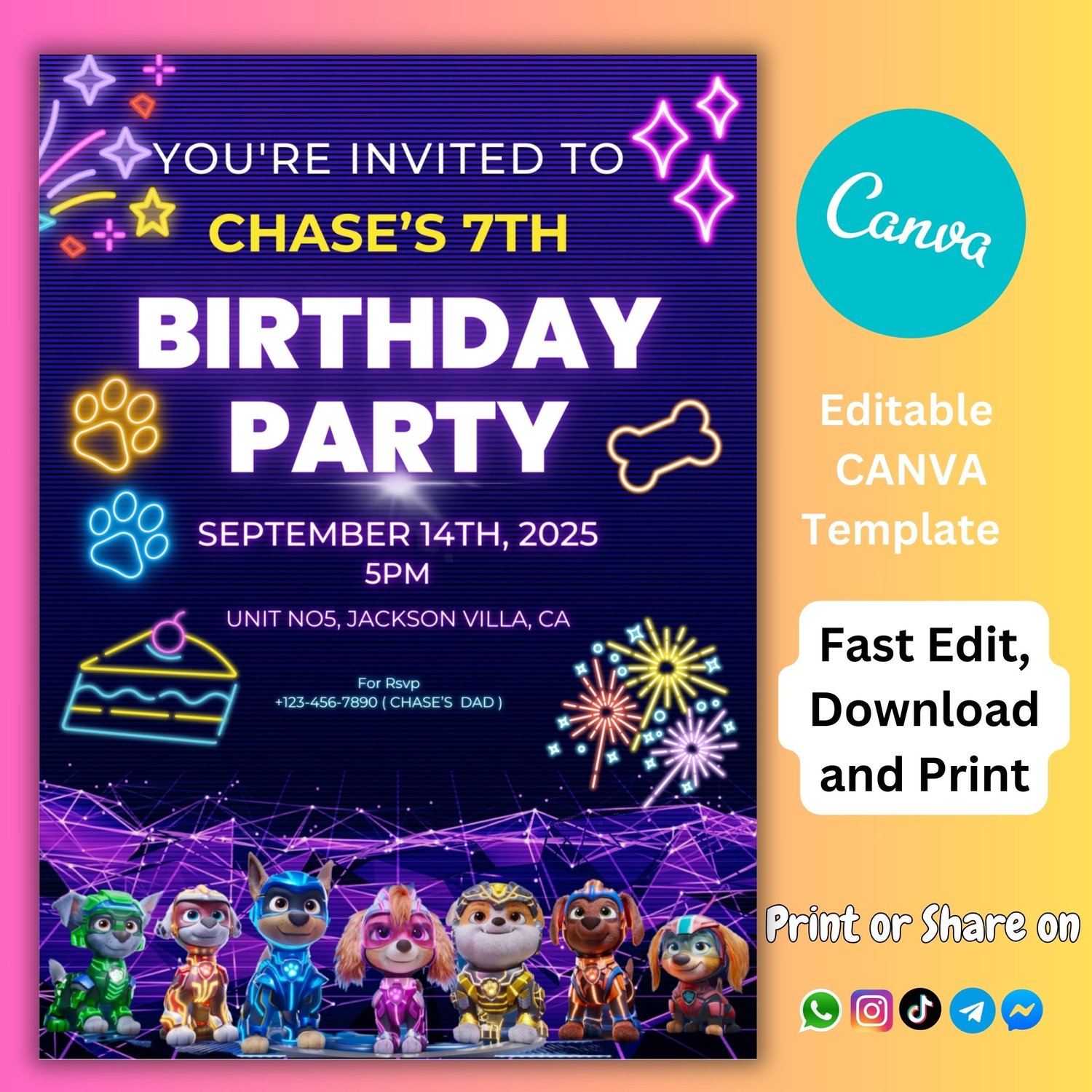 Introducing our Neon Paw Patrol The mighty Movie 2023 Birthday Invitation! Perfect for throwing a fun-filled party that captures the spirit of one of the most beloved cartoon characters, Paw Patrol.