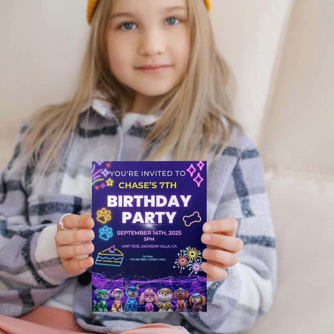 So why wait? Let the magic of Chase and his friends come alive with our Neon Paw Patrol The mighty Movie 2023 Birthday Invitation. Order yours today and get ready to witness the smiles and laughter of your little one and their friends as they embark on a Neon Paw Patrol The mighty Movie 2023-inspired adventure at the party of a lifetime.