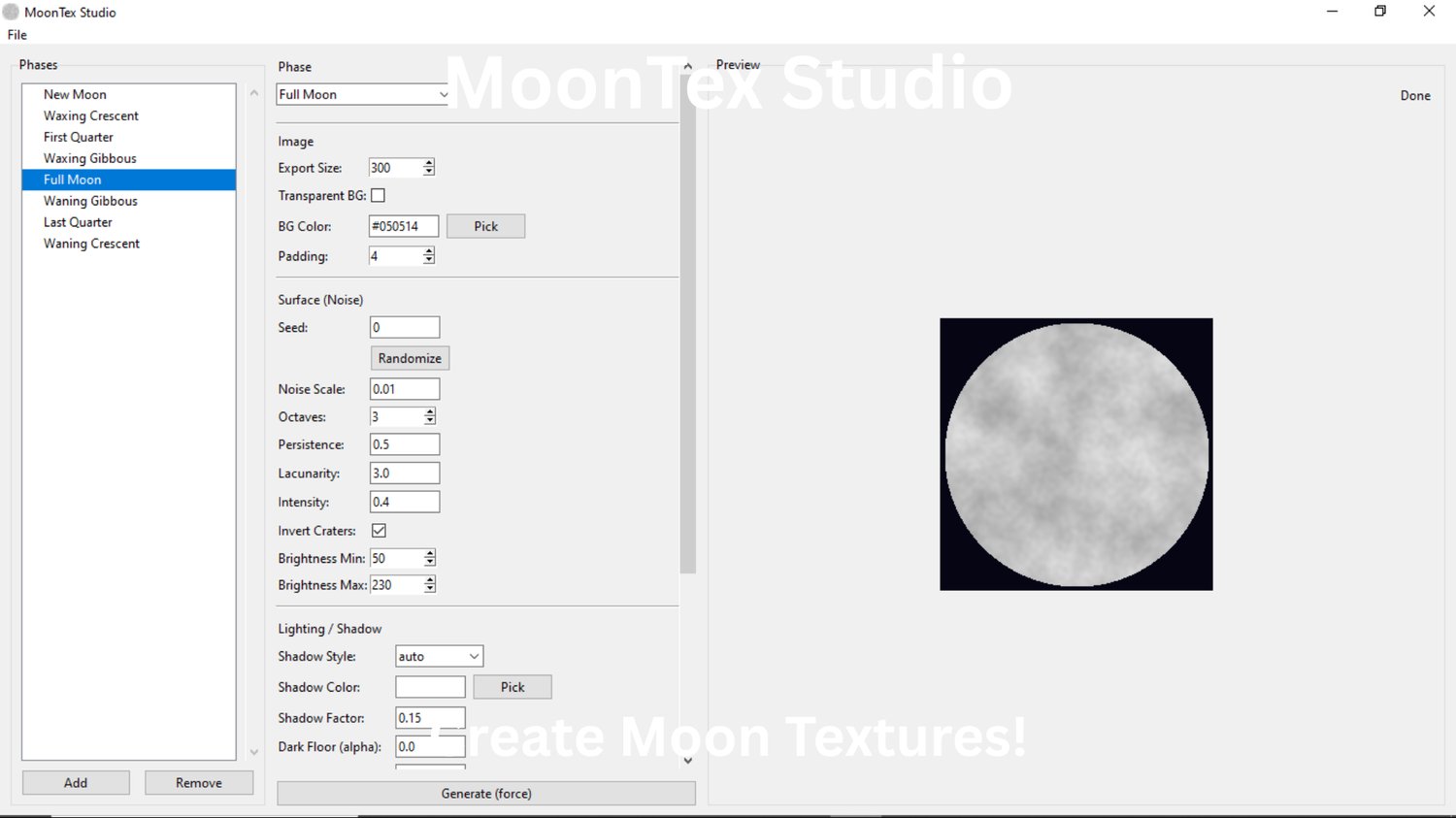 MoonTex Studio is built directly on top of the free MoonTex library and is designed to speed up iteration, reduce trial-and-error, and make moon generation workflows visual instead of code-only.