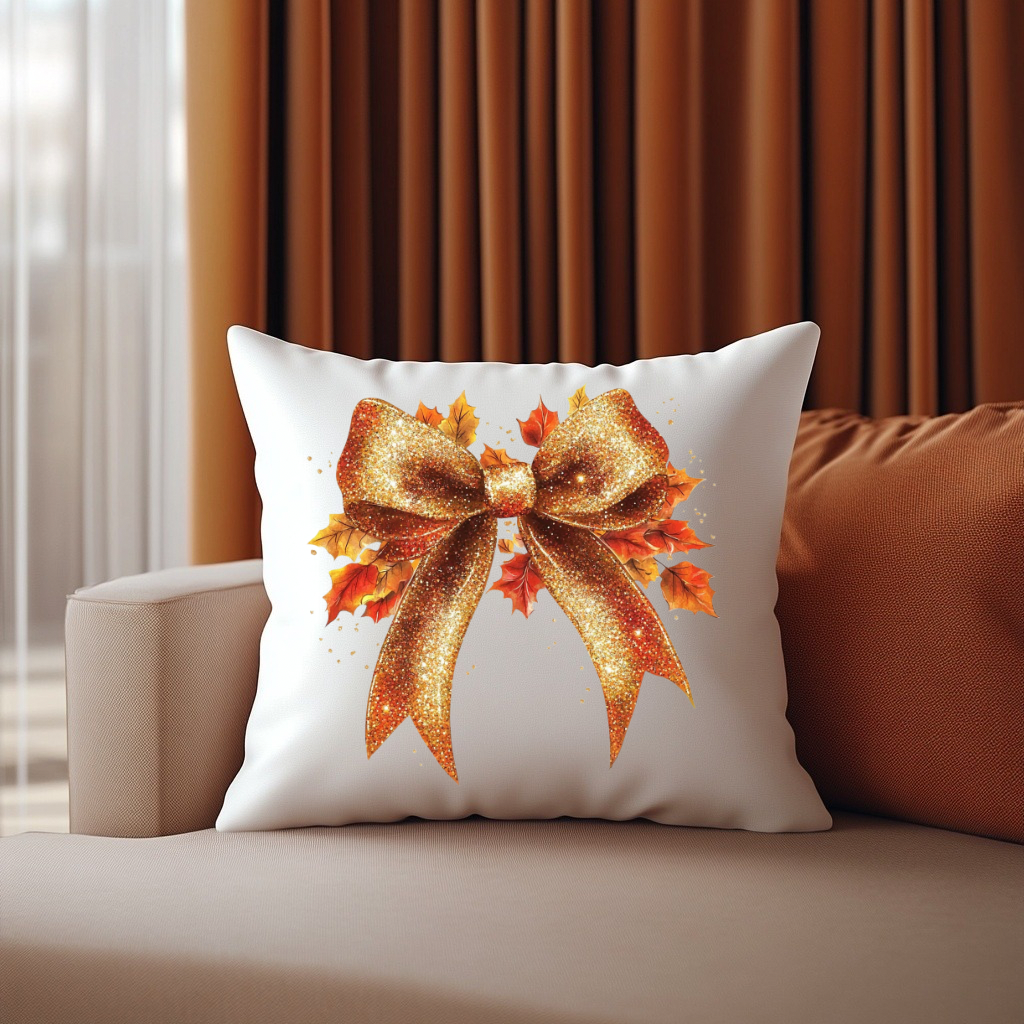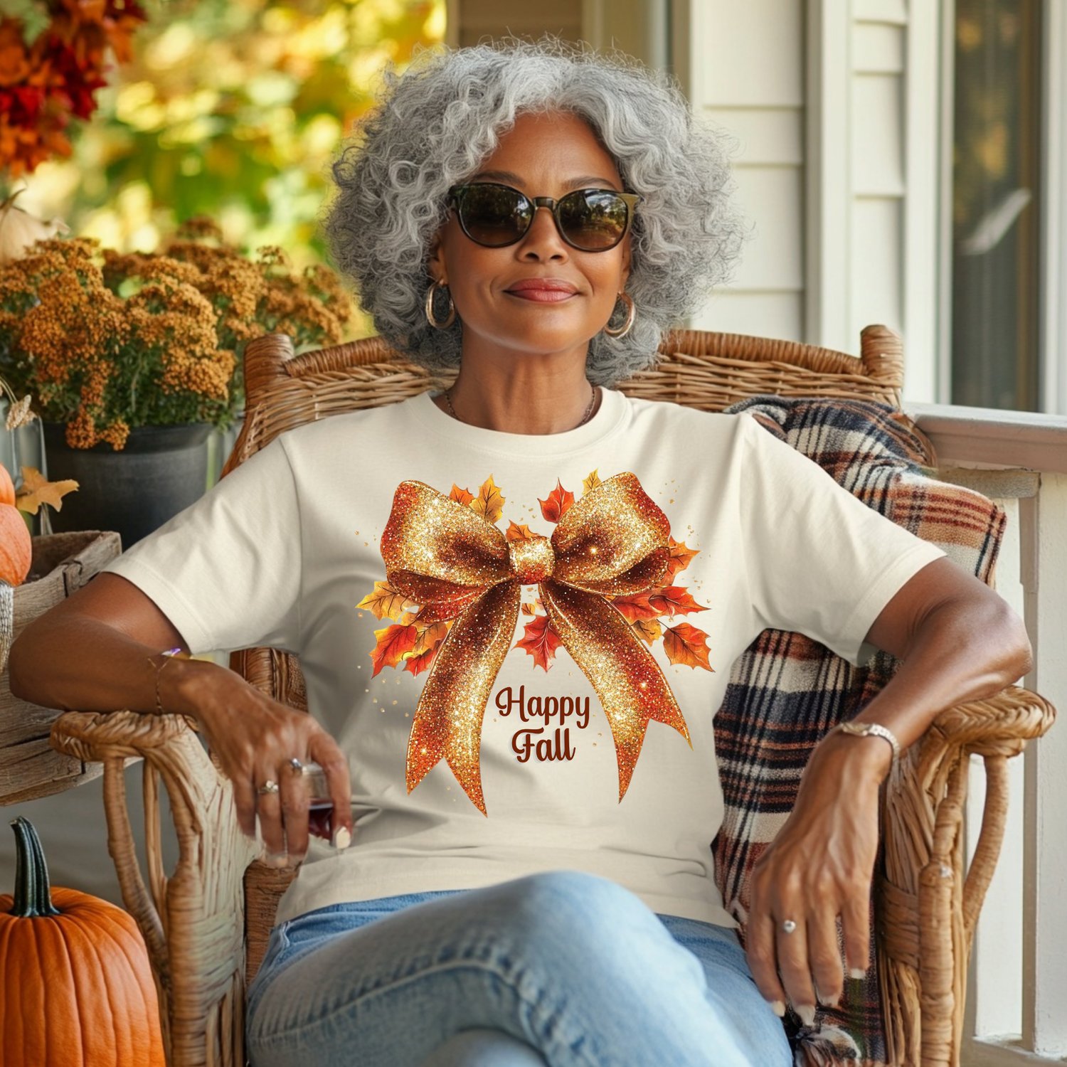 Happy Fall Glitter Bow PNG | Autumn Sublimation Design | Golden Bow with Fall Leaves | Digital Download for Shirts, Tumblers & Decor