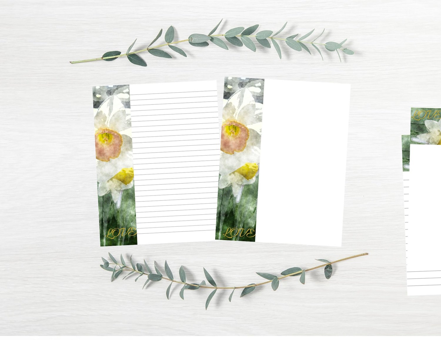- 4 pages each page has a gorgeous watercolor daffodil on a green background and the words love written on each page.