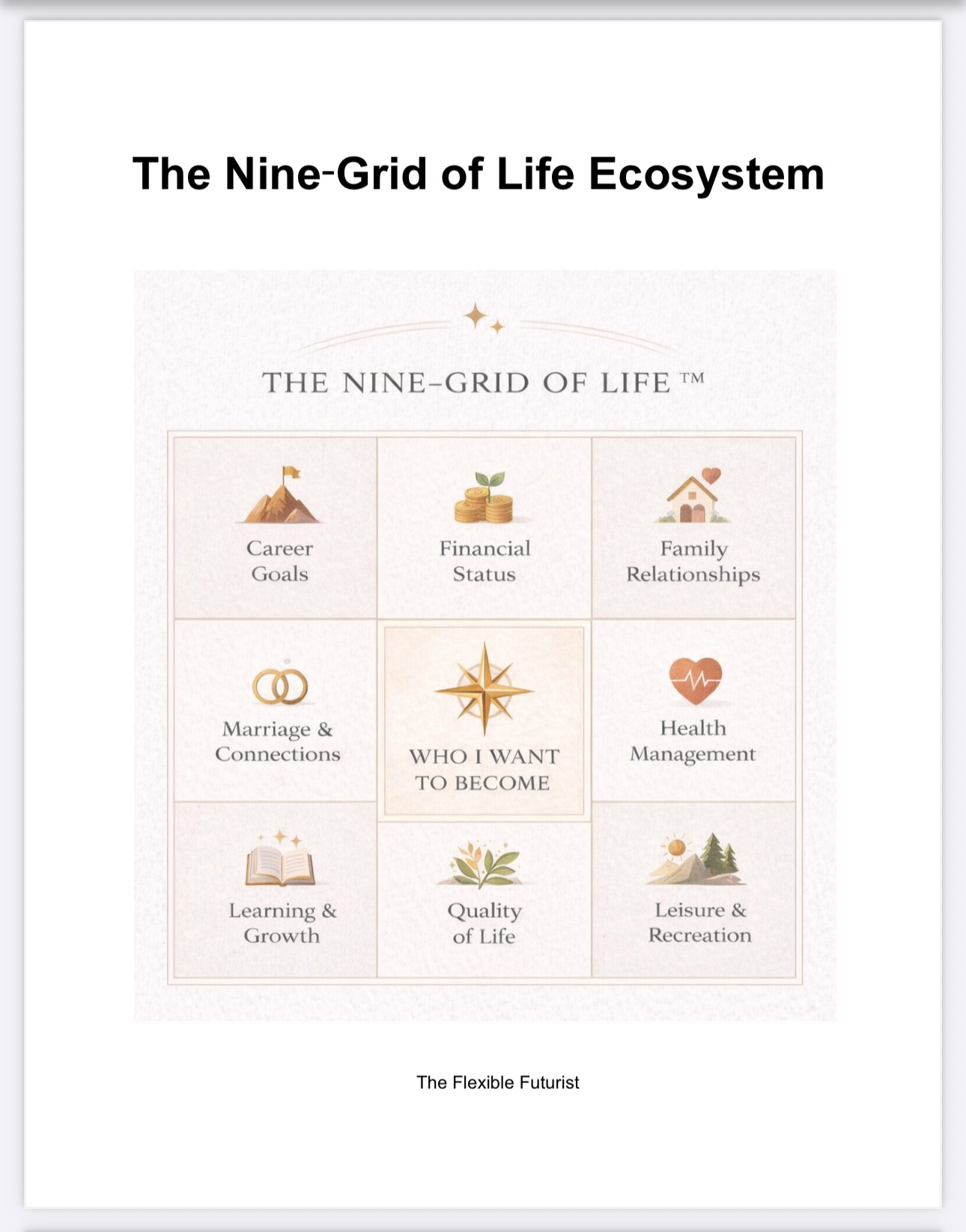 The Nine‑Grid helps you see your life clearly — where you’re aligned, where you’re stretched, and where your next chapter is quietly calling—a gentle, visual framework for designing a life that feels whole, grounded, and true.