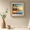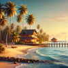 This picturesque scene captures the tranquility of a tropical beach at sunset. Tall palm trees sway gently in the sea breeze, and a cozy house with an ocean view is located right on the shore. A wooden pier stretches into the crystal blue waters, while small waves gently touch the sand. In the distance, rock formations add natural charm and contrast to the landscape. The soft warm colors of the sunset create a sense of peace and harmony.