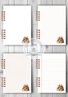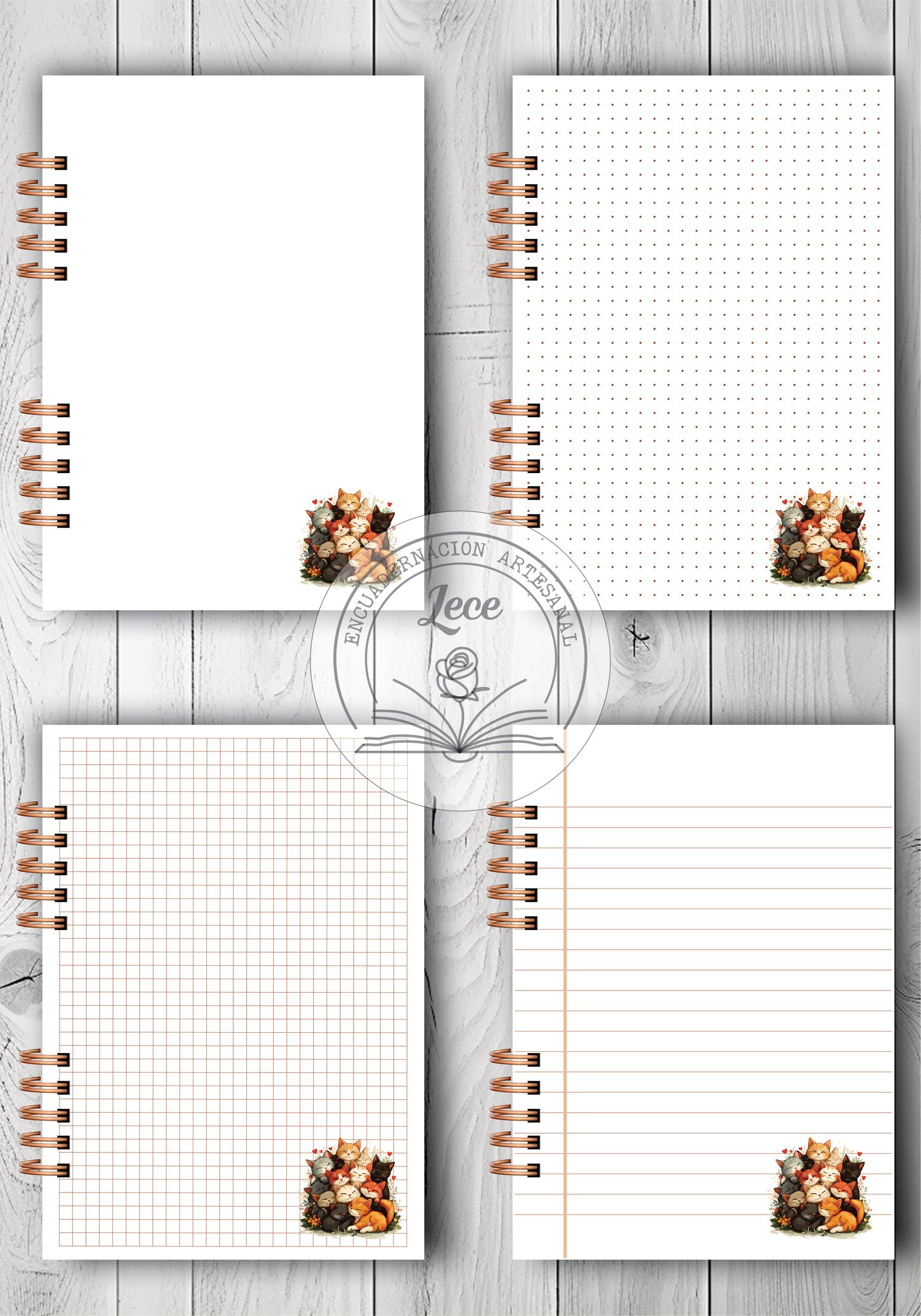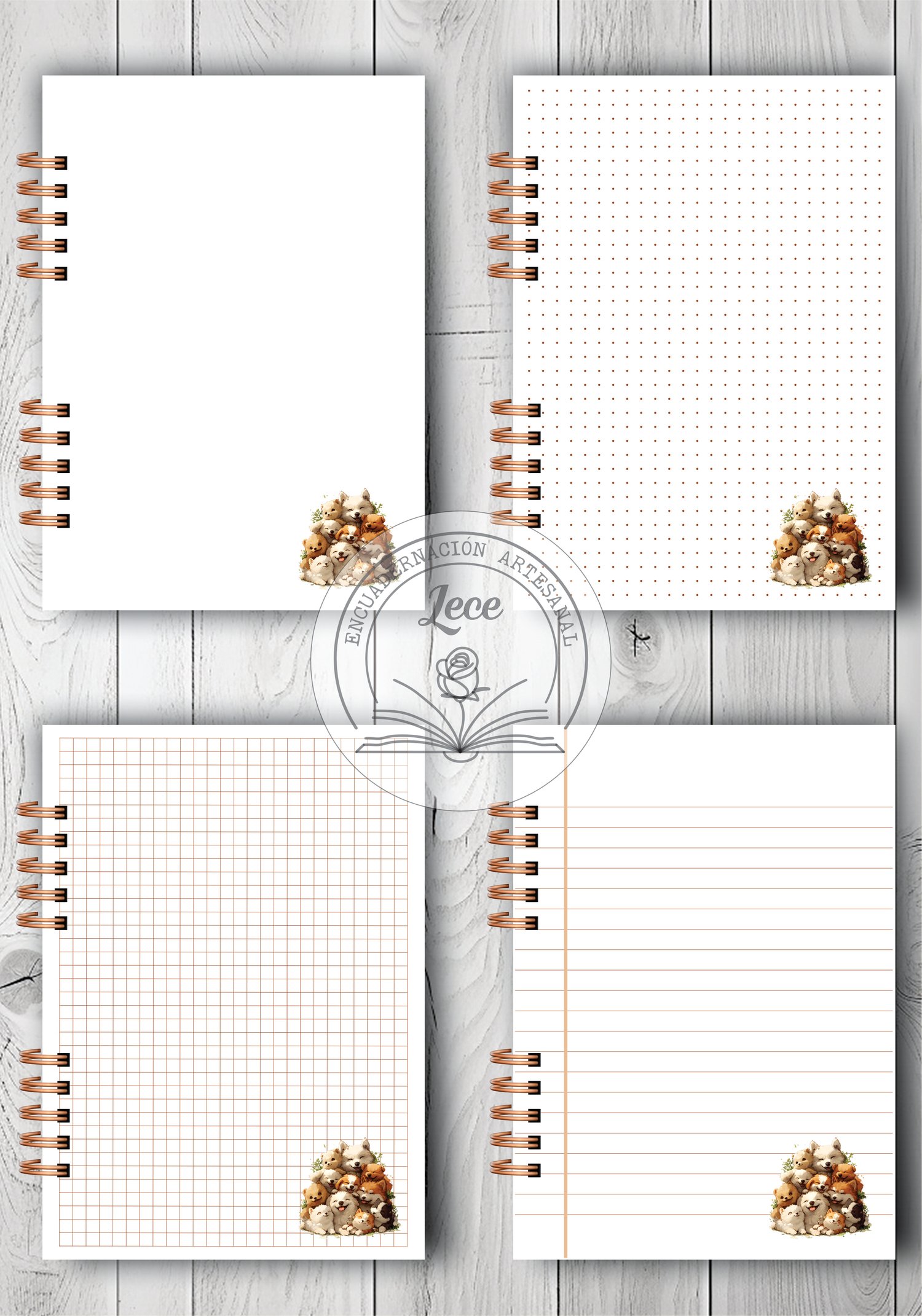 - 2 modelos de Interiores de 100 hojas con sus variantes para imprimir en tamaños A5 para anillado y costura en versión de hojas lisas, punteadas, cuadriculadas y rayadas.