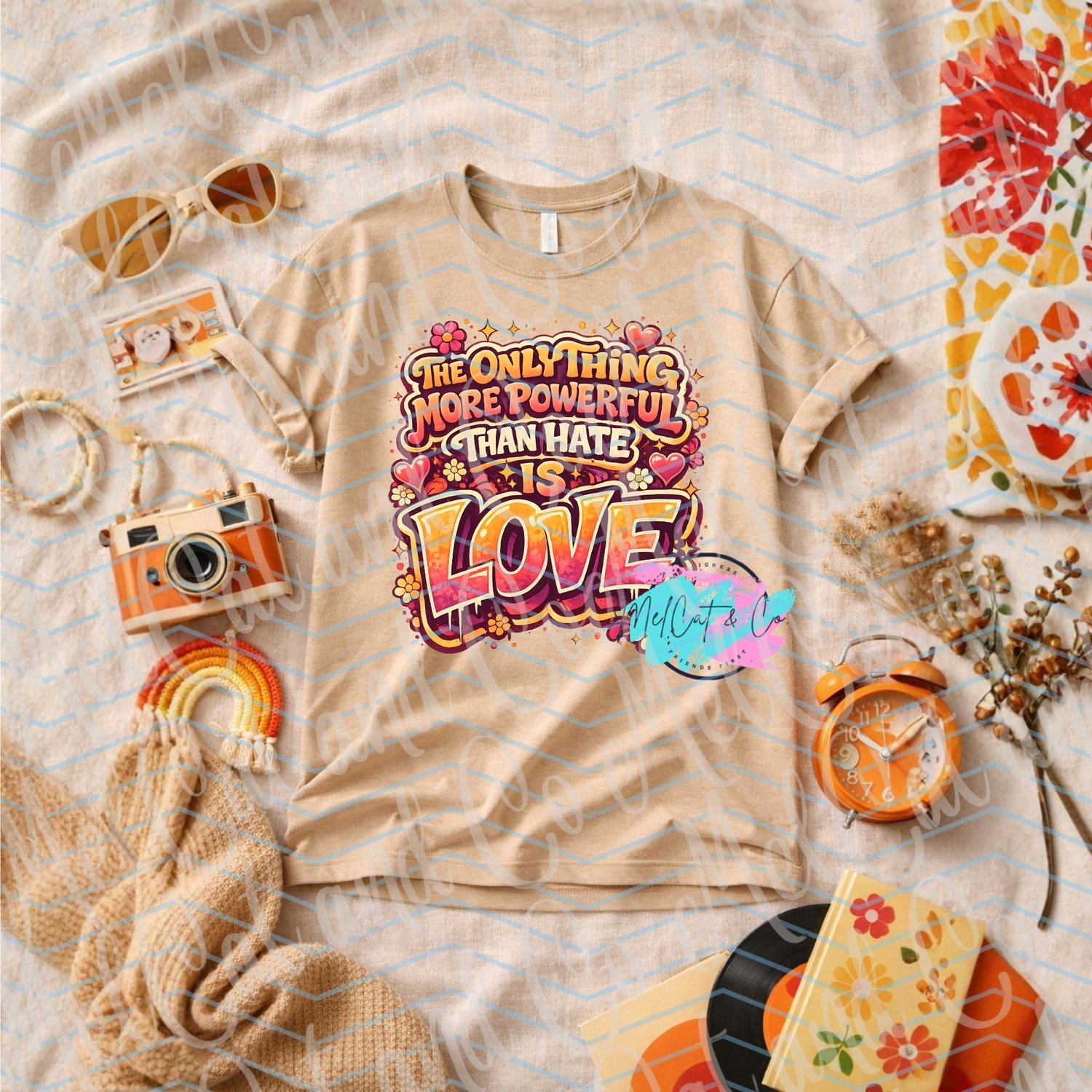 “The Only Thing More Powerful Than Hate Is Love” in bold, retro-inspired lettering with warm sunset tones, hearts, flowers, and sparkling details.