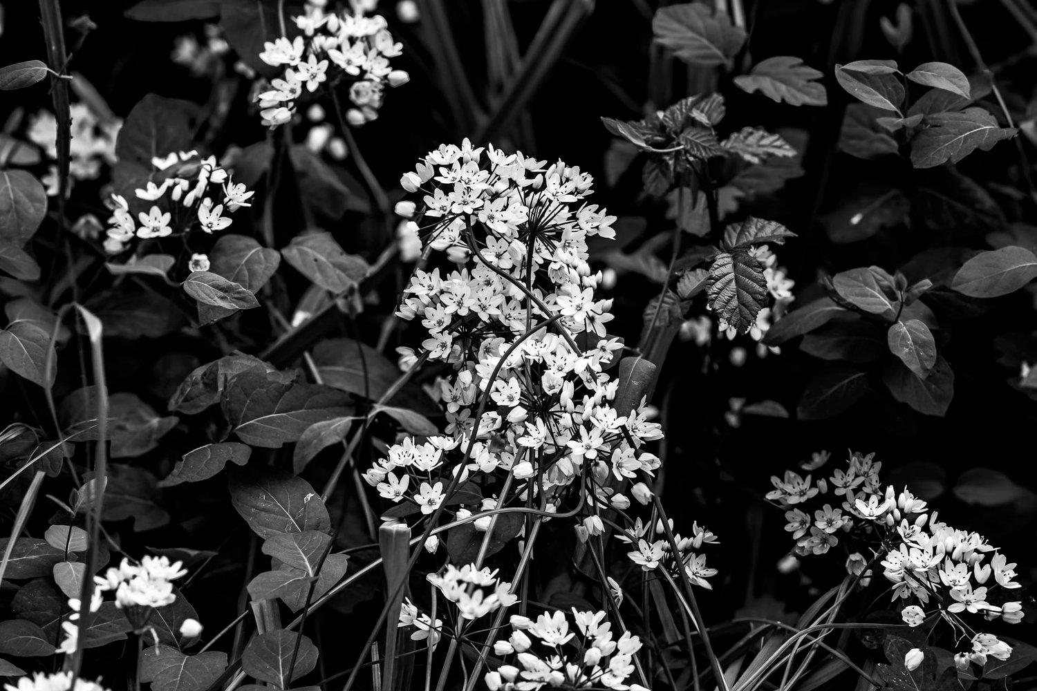 Delicate white flowers are clustered among a dense tangle of dark leaves. The grayscale effect emphasizes the contrast between the bright blossoms and the surrounding foliage.