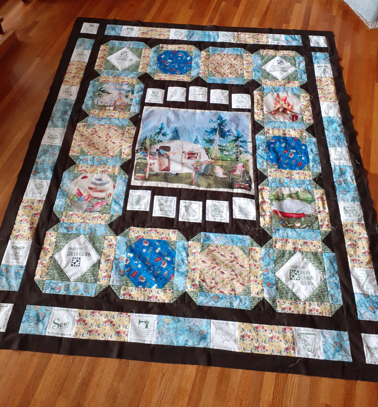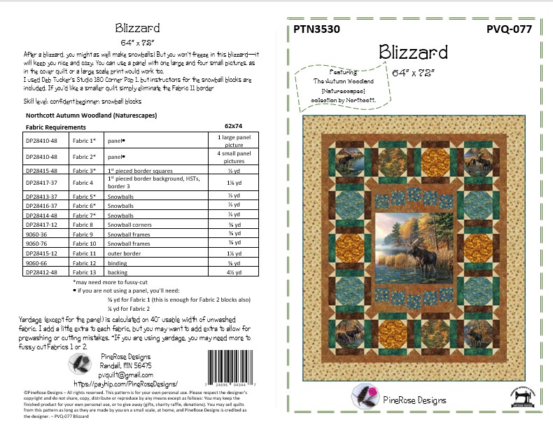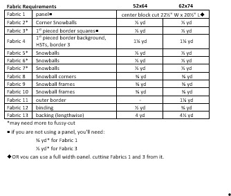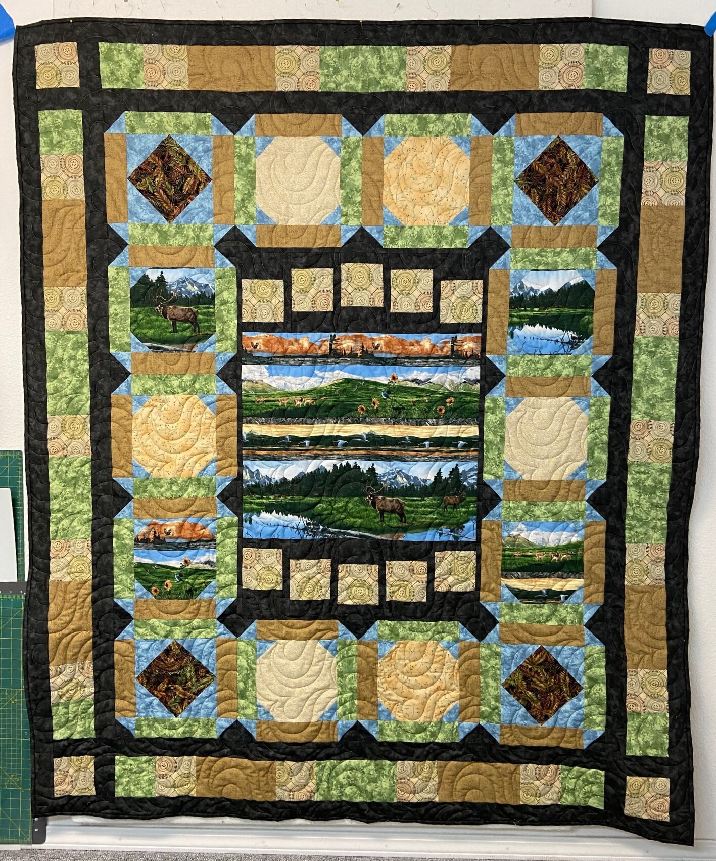 I first made this pattern with the All Minnesota Shop Hop fabric for 2022 (white blocks above the center panel), and tester Dotty made that version also (the yellow/green/brownish). I did change it a bit, and omitted the square-in-a-square blocks in the corners of the snowball border. Tester Ruth made the one with the blue moose panel.