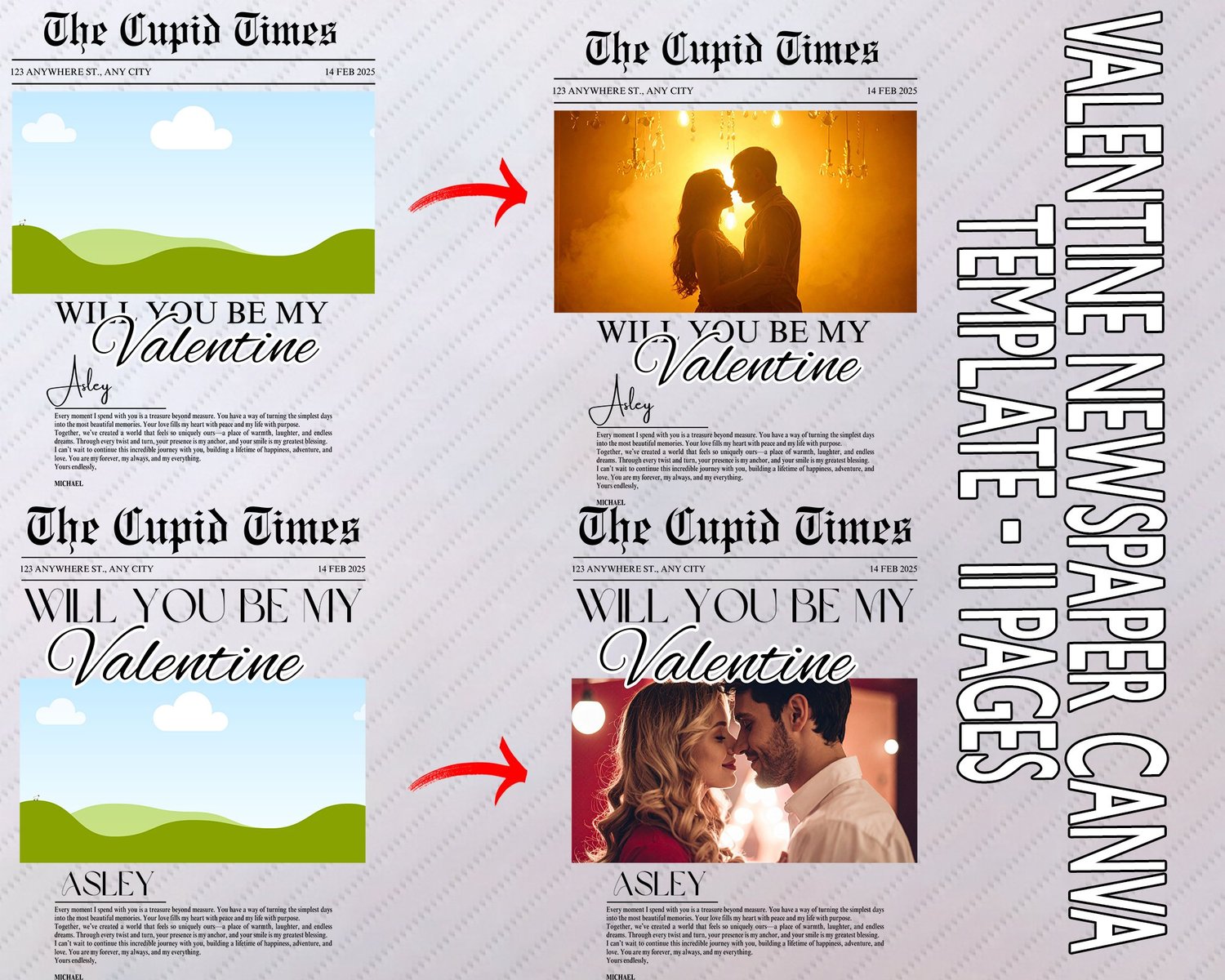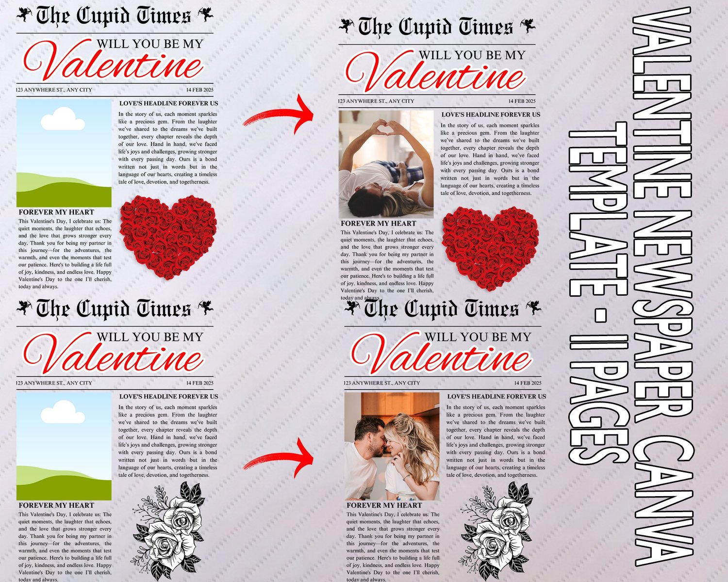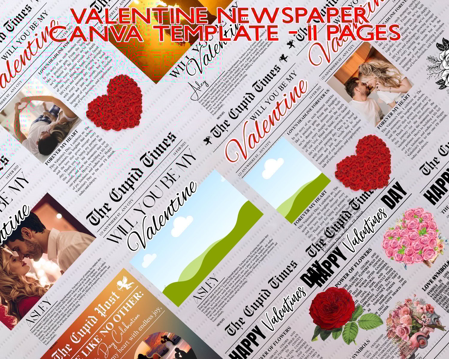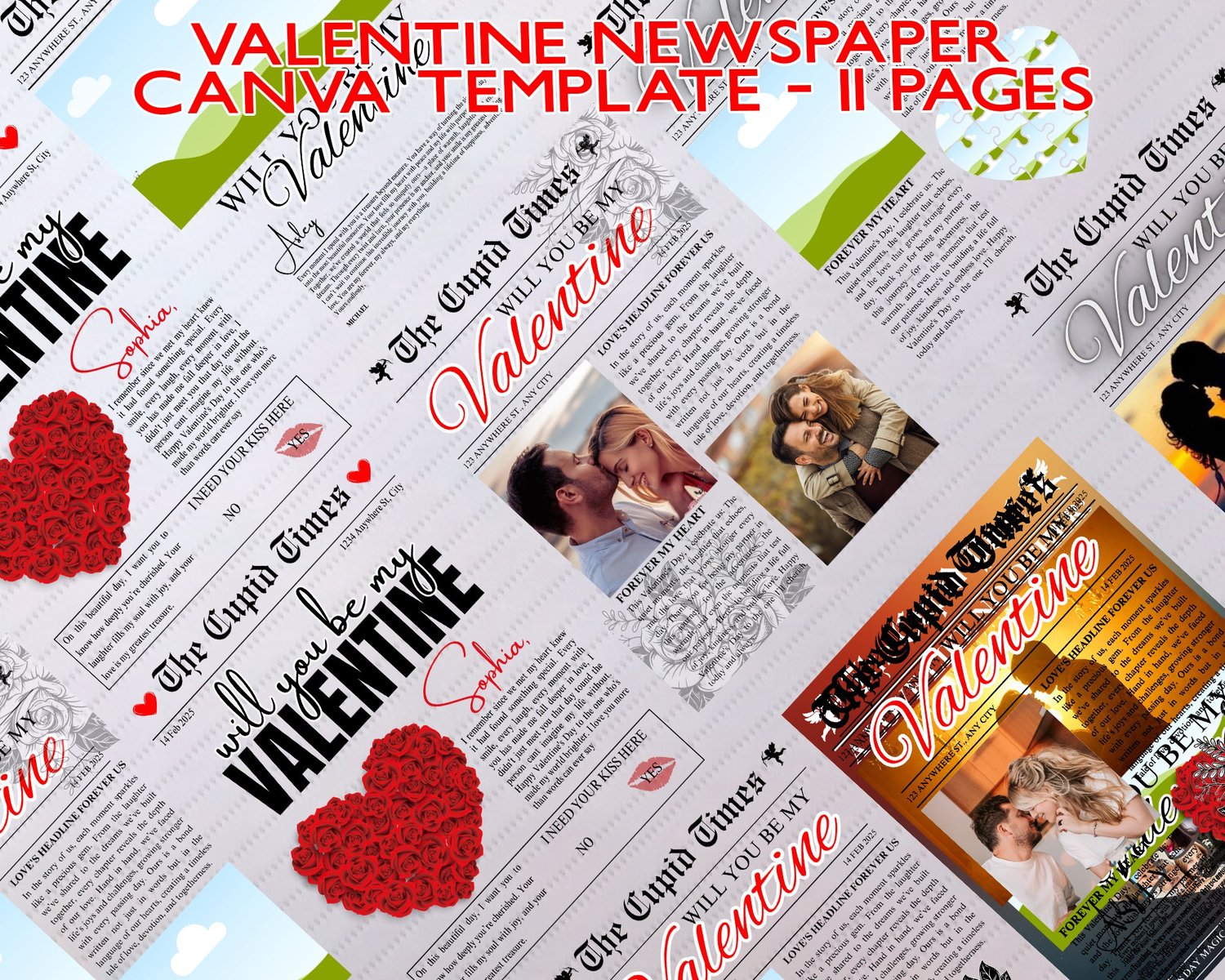 Valentine Newspaper Canva Template – 11 Pages Editable Valentine Magazine Drag & Drop Photo Newspaper Romantic Newspaper Template