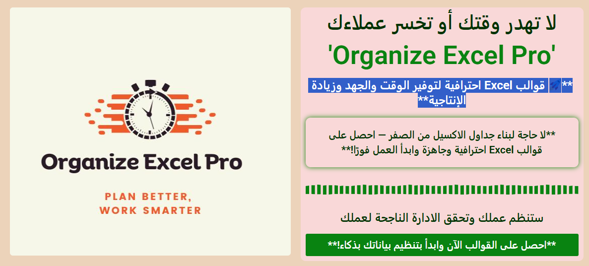 هل تشعر بالإرهاق وسط الفوضى؟ الحل بين يديك! **Organize Excel Pro** يمنحك السيطرة الكاملة على وقتك ومهامك، ويضعك على طريق النجاح بأقل جهد ممكن.
