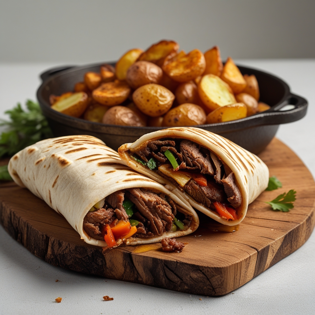 A crispy, golden-brown shawarma wrap, sliced in half, rests on a wooden board alongside a generous serving of fried potatoes, cooked to a golden crisp in a rustic, cast-iron cookware, with a subtle sheen of oil, set against a clean, neutral background, with the shawarma's juicy meat and crunchy vegetables spilling out, invitingly lit to accentuate the textures and warmth of the dish, evoking the aroma of a bustling street food market.