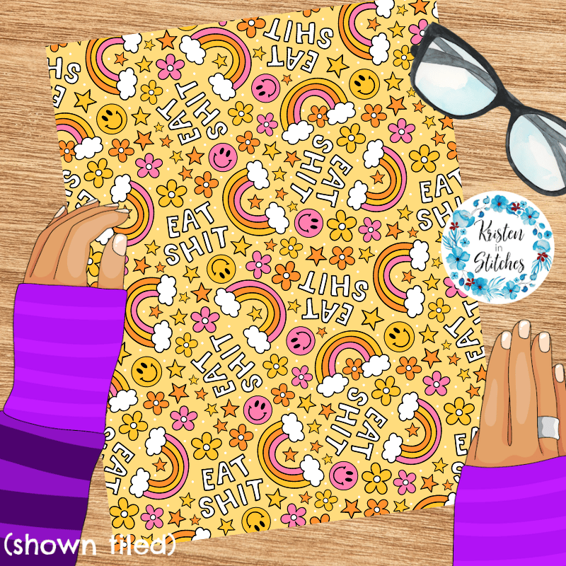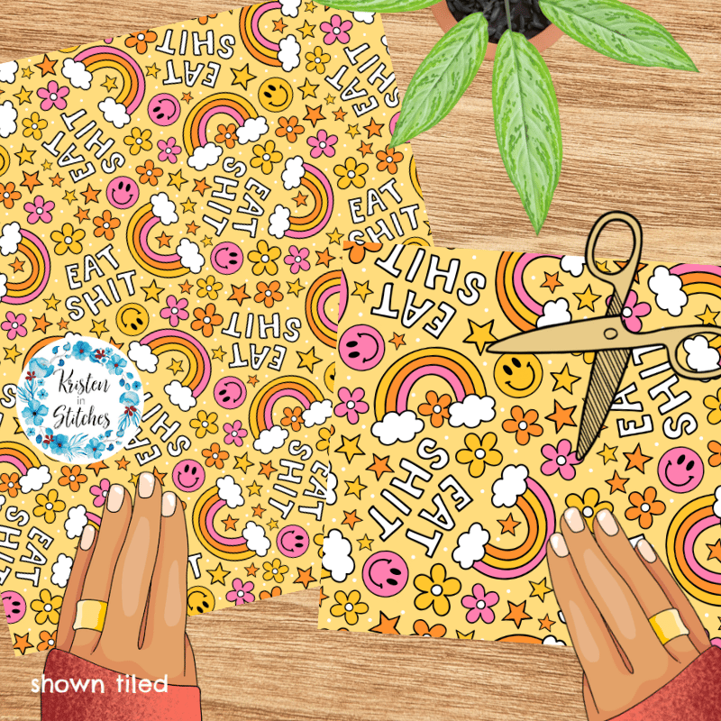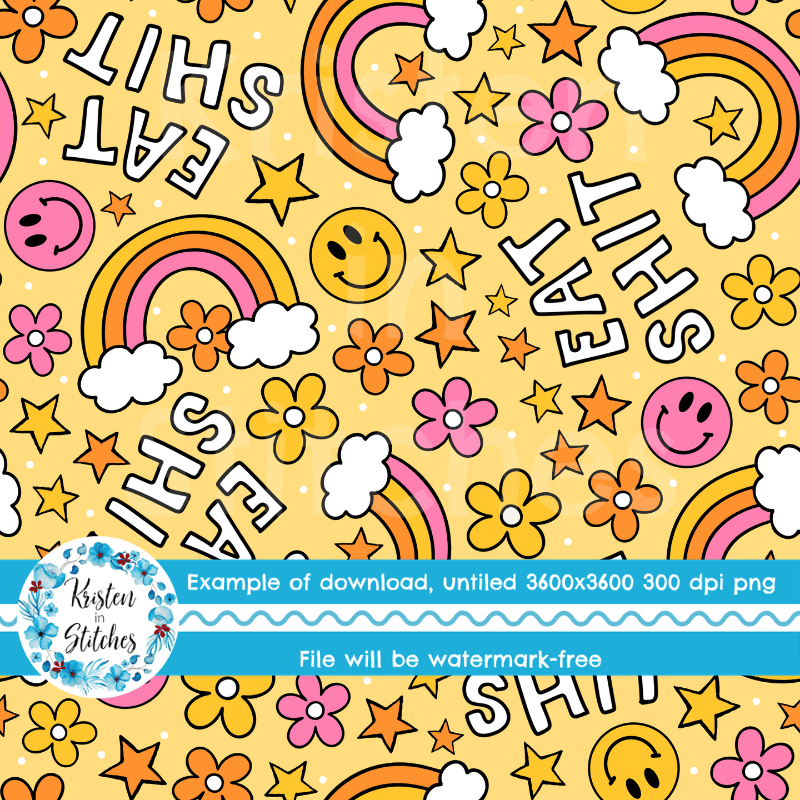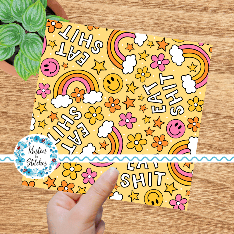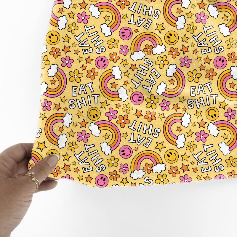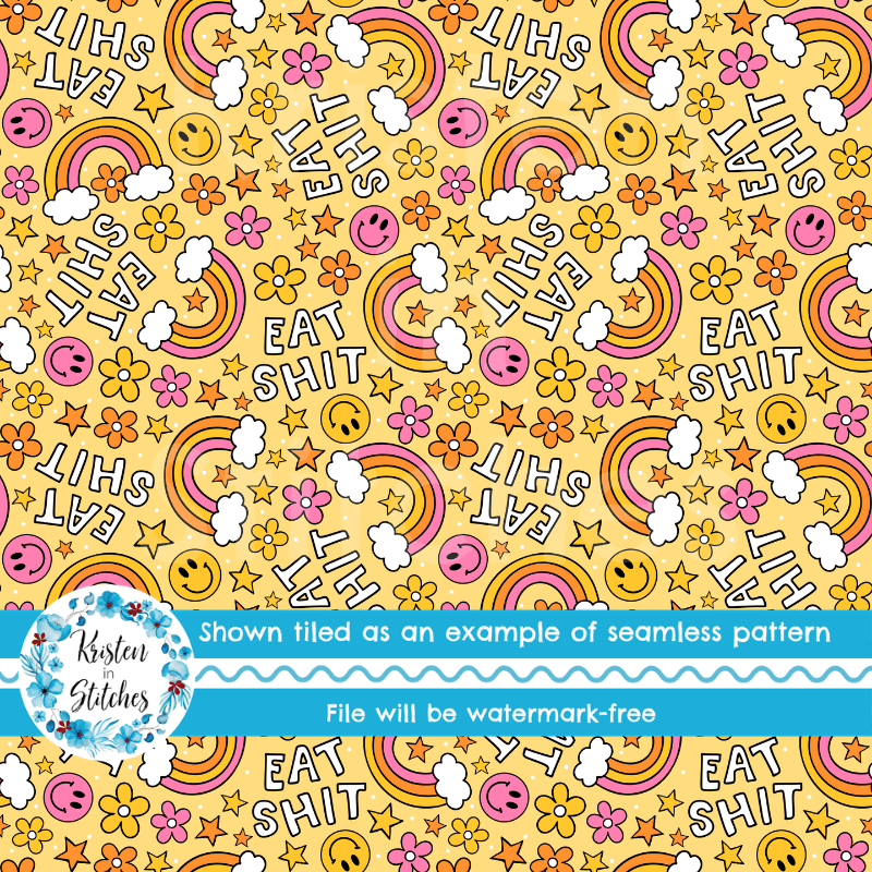 Eat Shit sarcastic pattern with flowers, happy faces and rainbows.