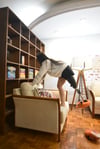 She starts to study, reads her entire dissertation, figures out she needs to do some research and decides to get a book from the shelf, climbs into an armchair and tries to pick up the book when she loses her balance and falls on the floor, she feels it when she breaks her ankle besides twisting her knee, and when trying to put her hand on the ground, she breaks her wrist.