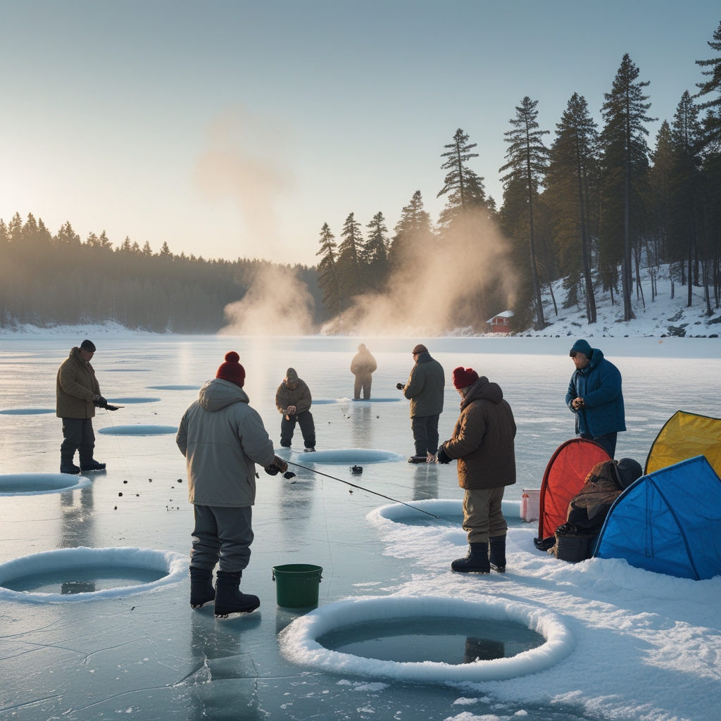 "A group of people ice fishing on a frozen lake during winter. They are dressed in warm winter clothing, gathered around small fishing holes cut into the thick ice, with colorful ice shanties scattered across the lake. Snow covers the surrounding landscape, and tall pine trees line the horizon. The scene captures the calm, quiet atmosphere of a frozen winter morning, with soft sunlight reflecting off the ice and subtle steam rising from the fishing holes. Some people are actively fishing, while others are chatting or tending to their gear, creating a cozy and peaceful winter outdoor scene."