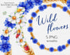 Wreaths. Wheat spike lets, wild white and blue flowers.
