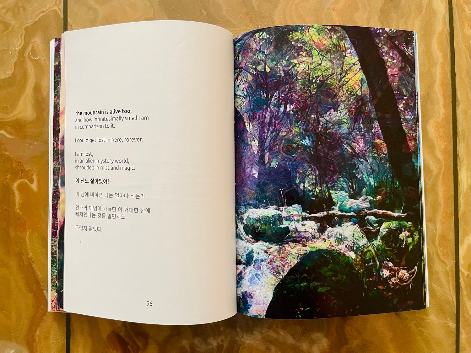It is a true story written in both English and Korean, accompanied by powerfully transformative images collaged from photos taken during the actual journey up the mountain.