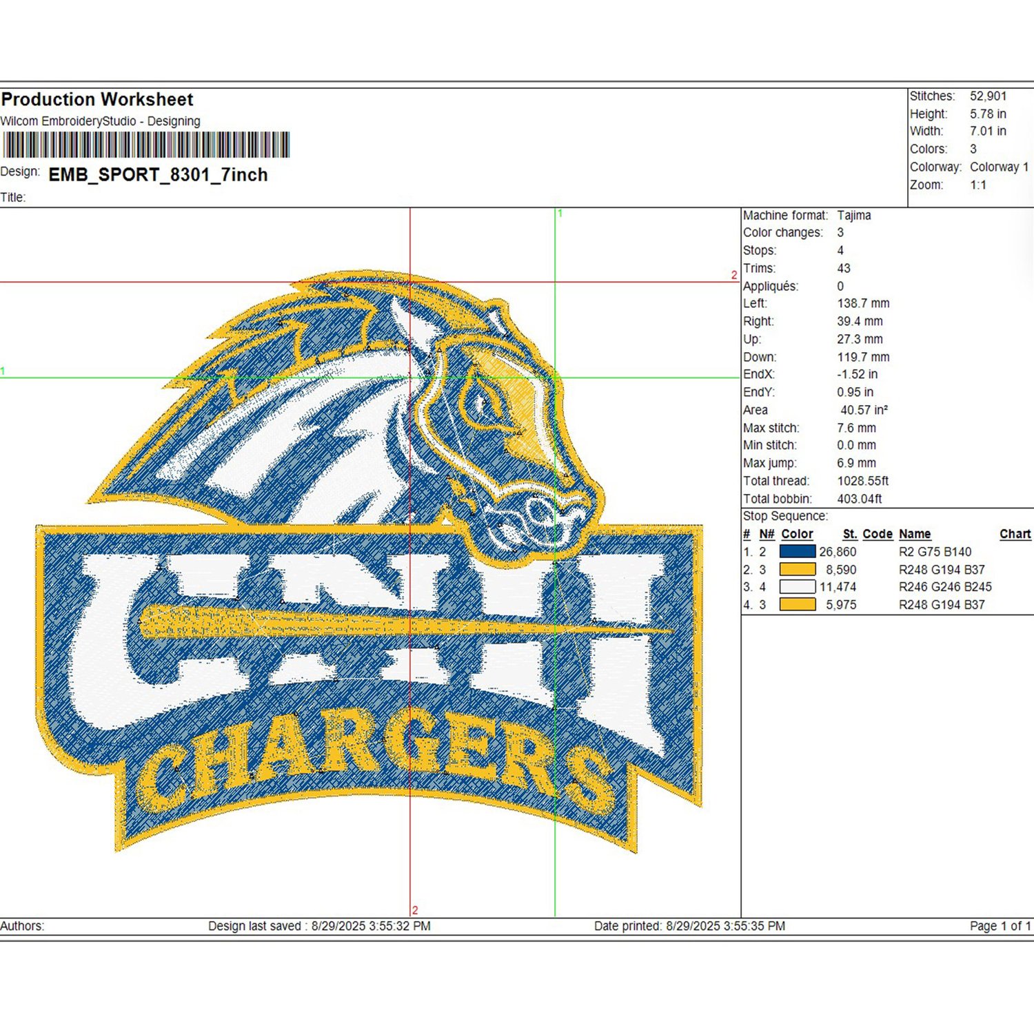 UNH Chargers Football Team Logo Embroidery Designs, Ncaa Embroidery Files, NCAA New Haven Chargers Team Logo Embroidery, Game Day Machine Embroidery Design, Digital Download