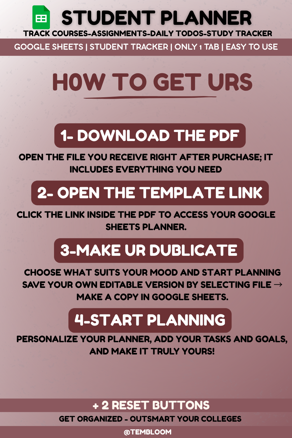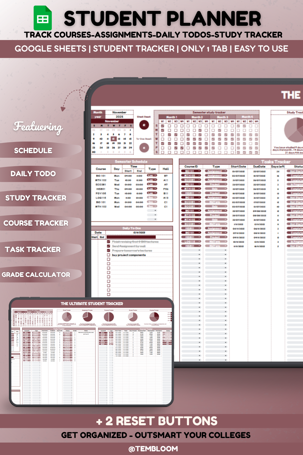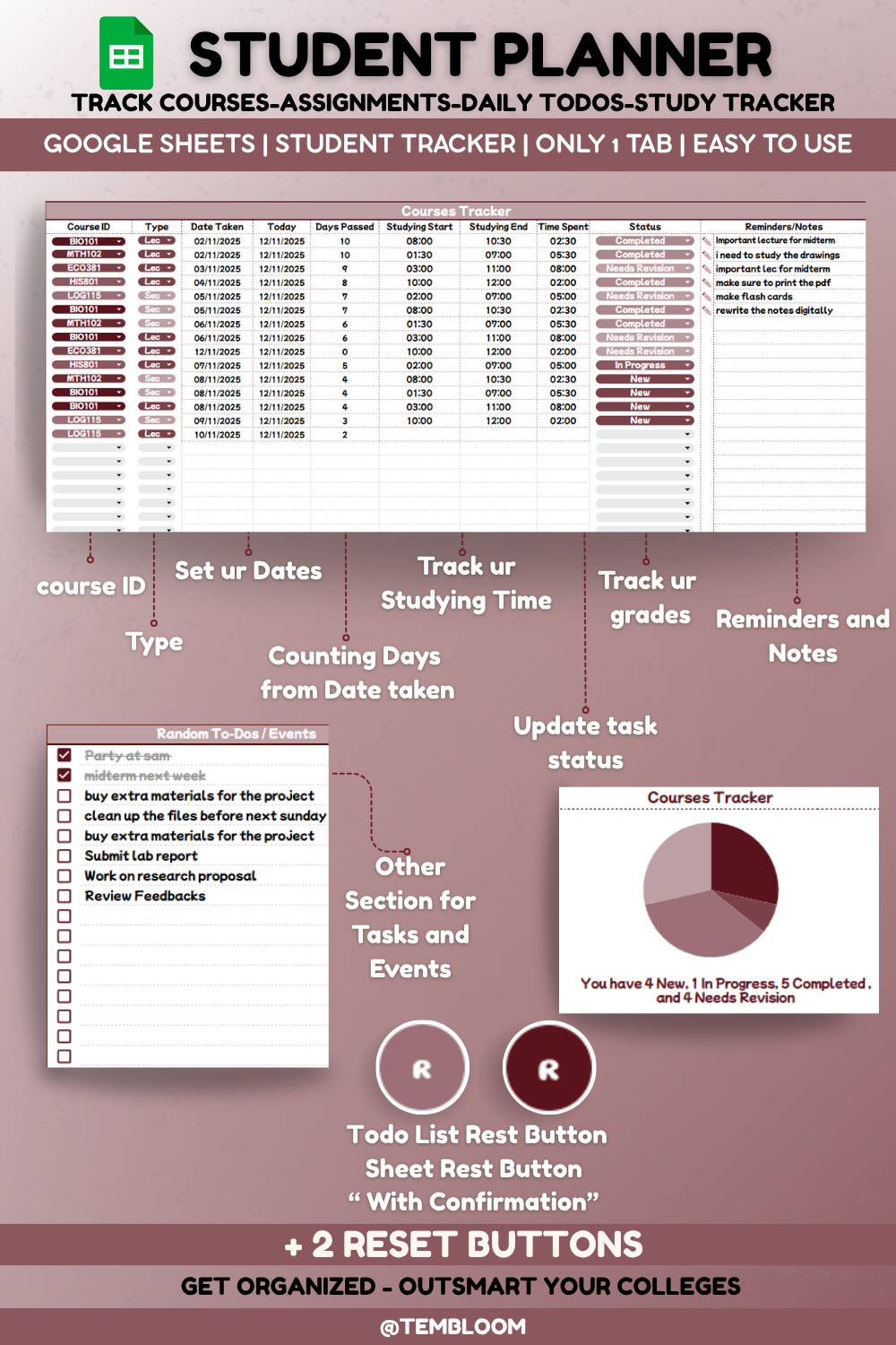 ✅ Two Reset Buttons – Clear your sheet in one click and reuse it every semester, clear your daily and random To-Dos separately and reuse them every day with ease separately