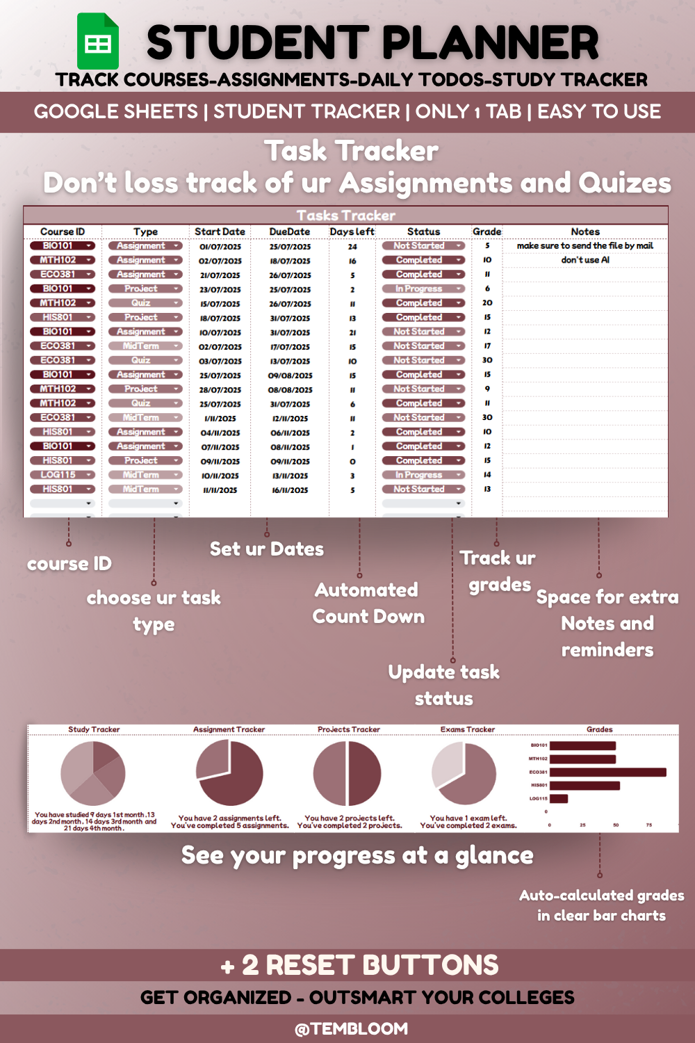 Take full control of your academic journey with this all-in-one Google Sheets student planner, designed to keep everything in one place — from your daily tasks to your semester-long goals. With a smart layout and visually engaging progress trackers, managing your courses, deadlines, and grades has never been easier (or more satisfying!).