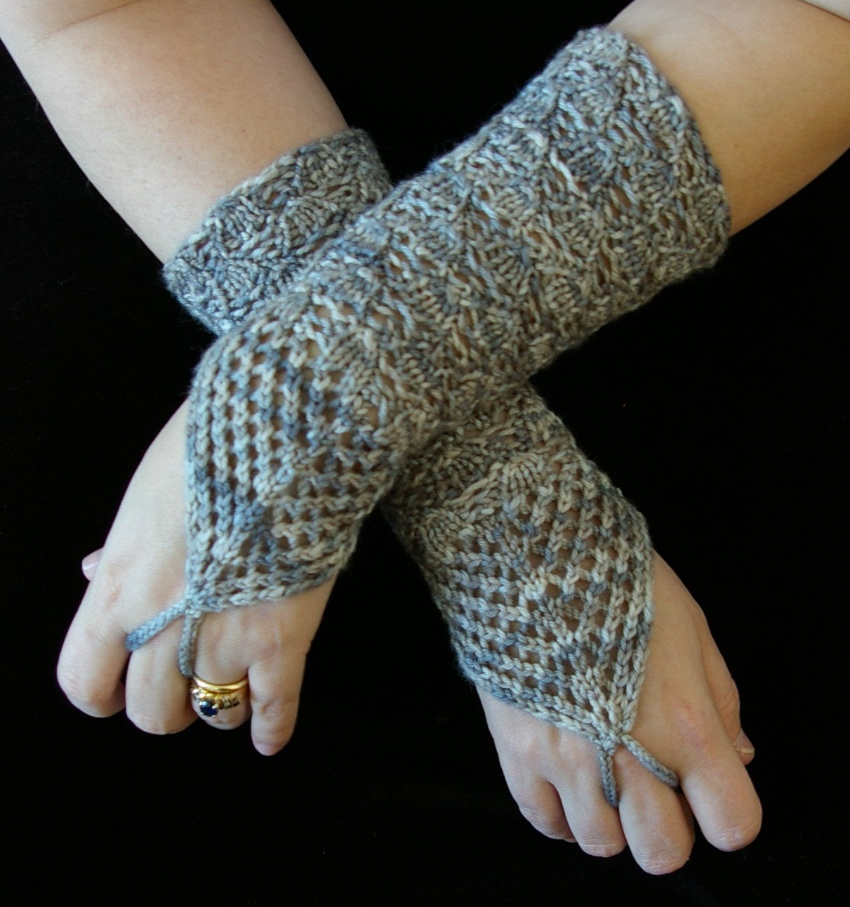 The back of the hand has tracery lace that is reminiscent of the chandelier’s chains, while the drop lace pattern on the hand reminds one of the crystals. The gloves are knit flat and shaped from the finger loop up to the mid-arm with simple increases, then seamed up the underarm. Since there is no shaping for fingers this project will be ready for opening night even if you start it at the dress rehearsal. The dramatic statement they make is good for any diva (operatic or not!).
