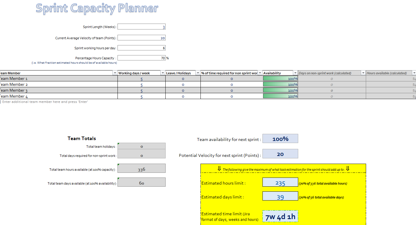 A basic sprint capacity planner which help you to view your teams capacity and potential velocity for the next sprint so that you can plan your sprint commitment more accurately.