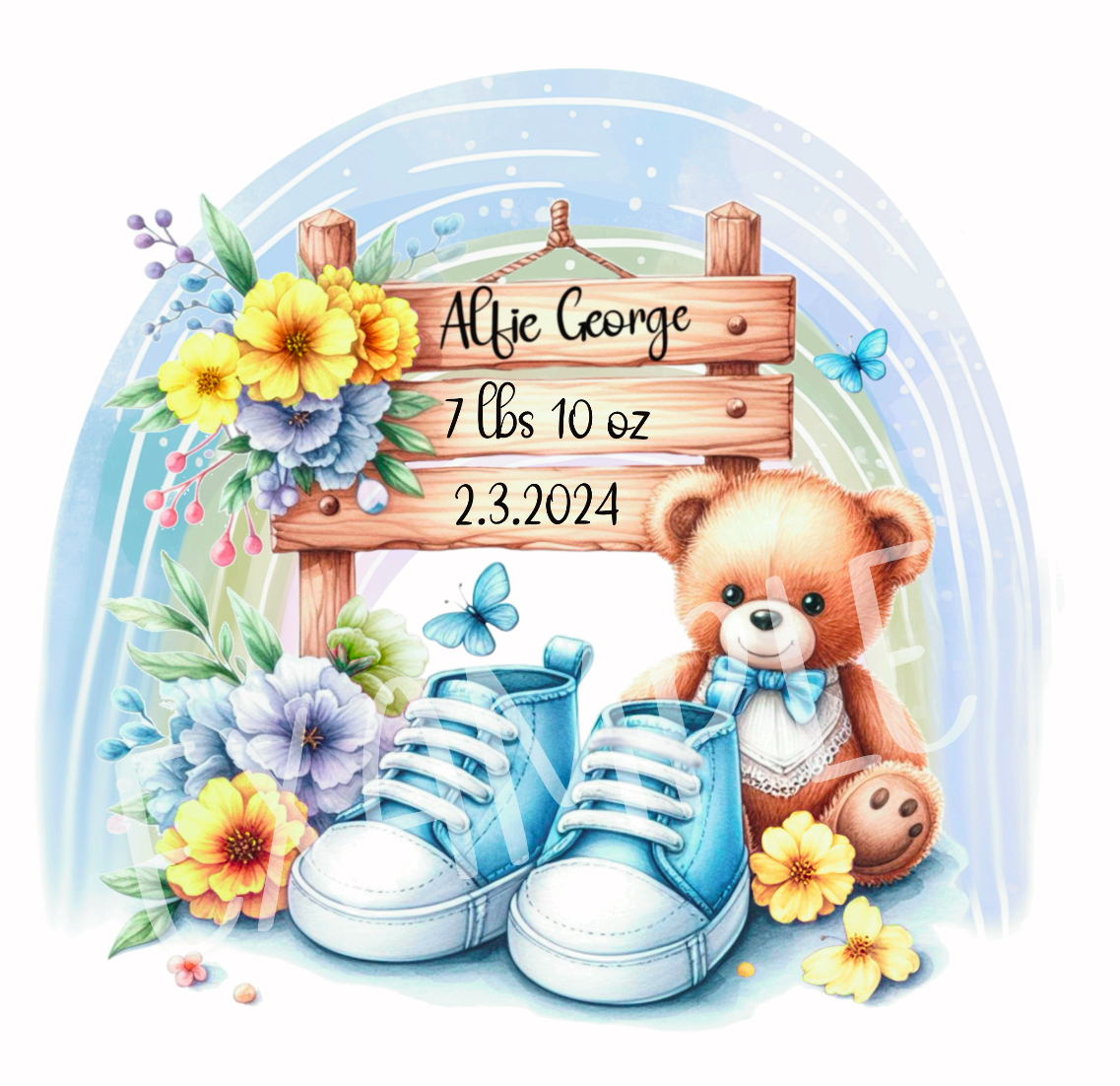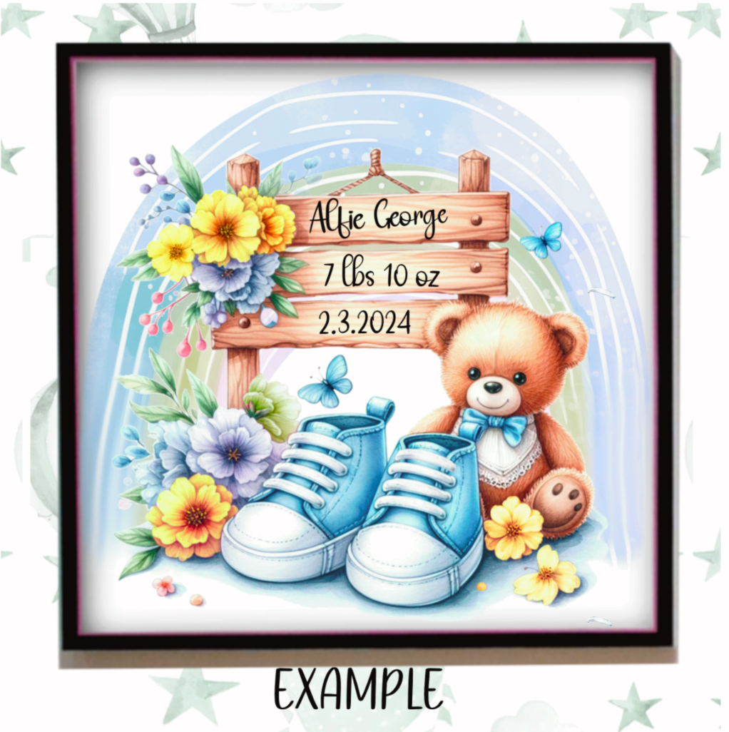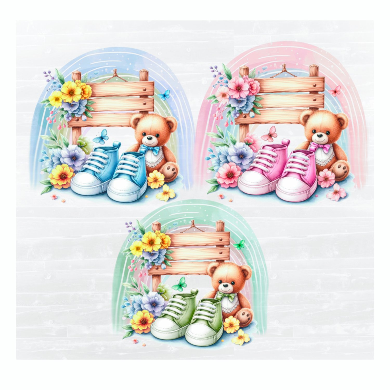 Beautiful nursery, baby birth announcement, featuring gorgeous watercolour teddy, a pair of cute sneakers and a wooden signpost to personalise. 3 designs; blue, pink and green.