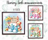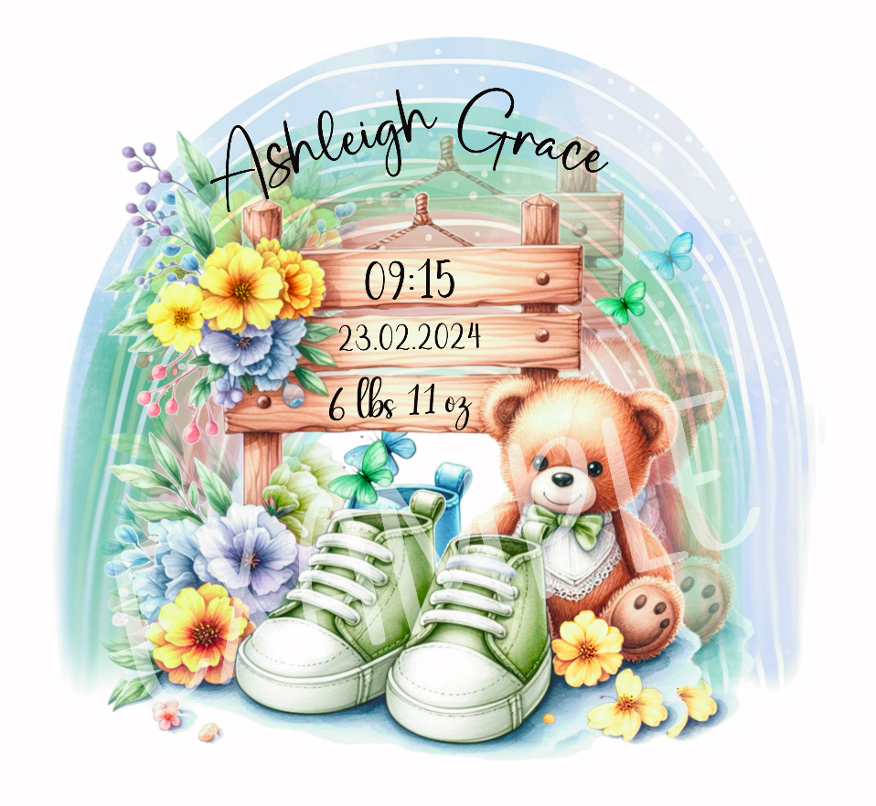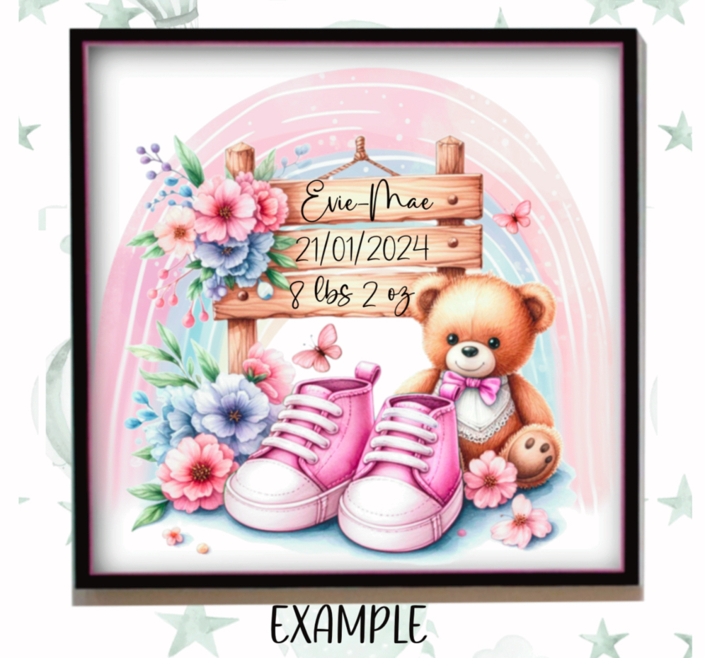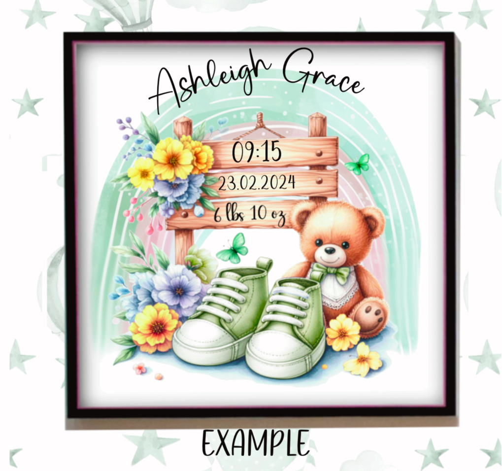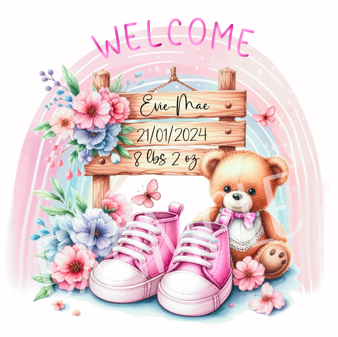 Beautiful nursery, baby birth announcement, featuring gorgeous watercolour teddy, a pair of cute sneakers and a wooden signpost to personalise. 3 designs; blue, pink and green.