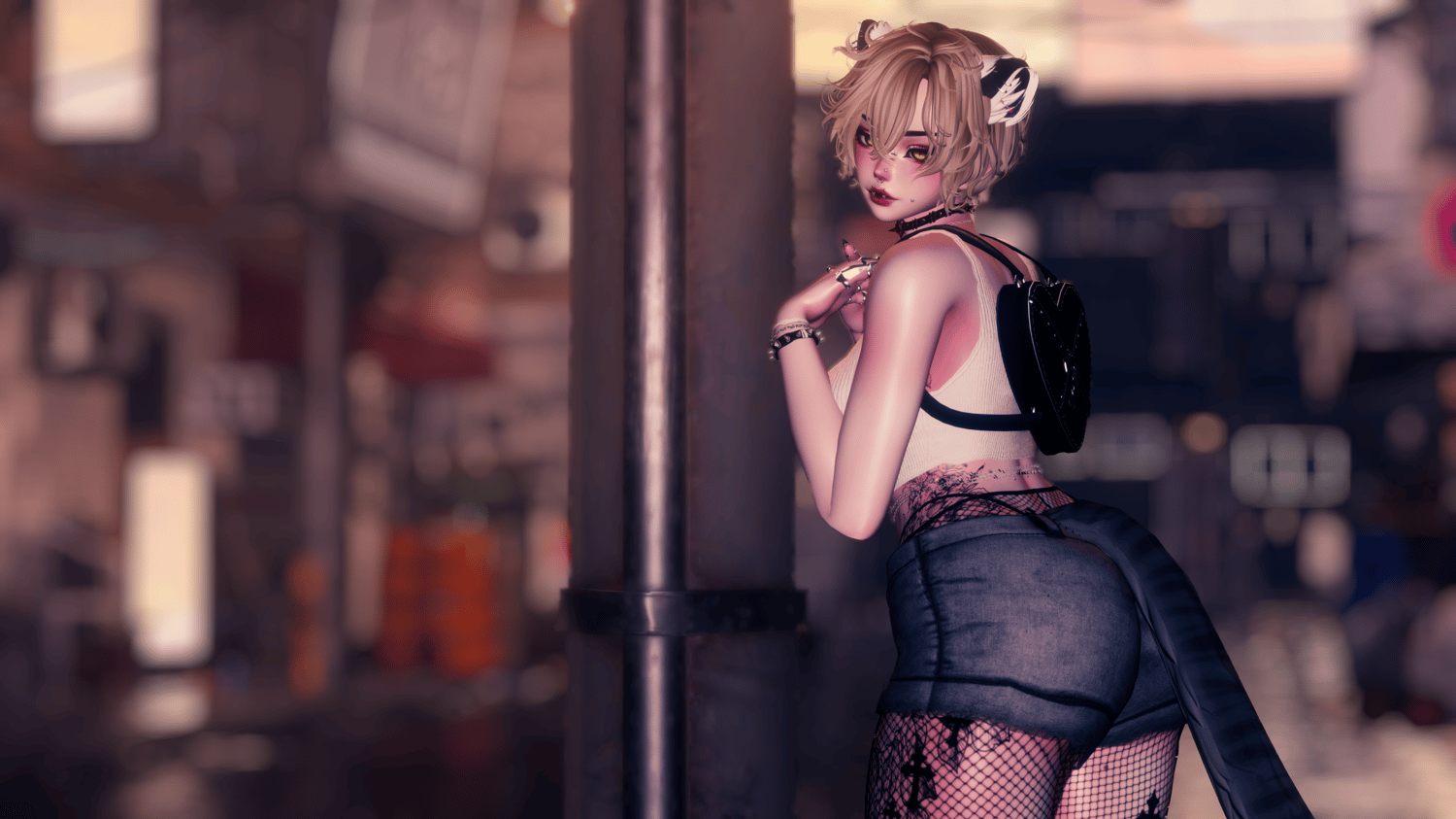 Body, Head (edit&makeup), eyes, hair 1, hair 2, hair 3, Ears/Tail, Bellychain, face piercings, septum, belly piercings, Choker, Bracelets, Claw nails, heels 1, heels 2, halter top, leather jacket, jeans, bikini, heart bag, hoop earrings, star earrings, pants, Skirt, rings 1, rings 2, ripped paper, cropped shirt, shorts, fishnets, amigu piece, tattoos, Kitty plush, Icons, necklace