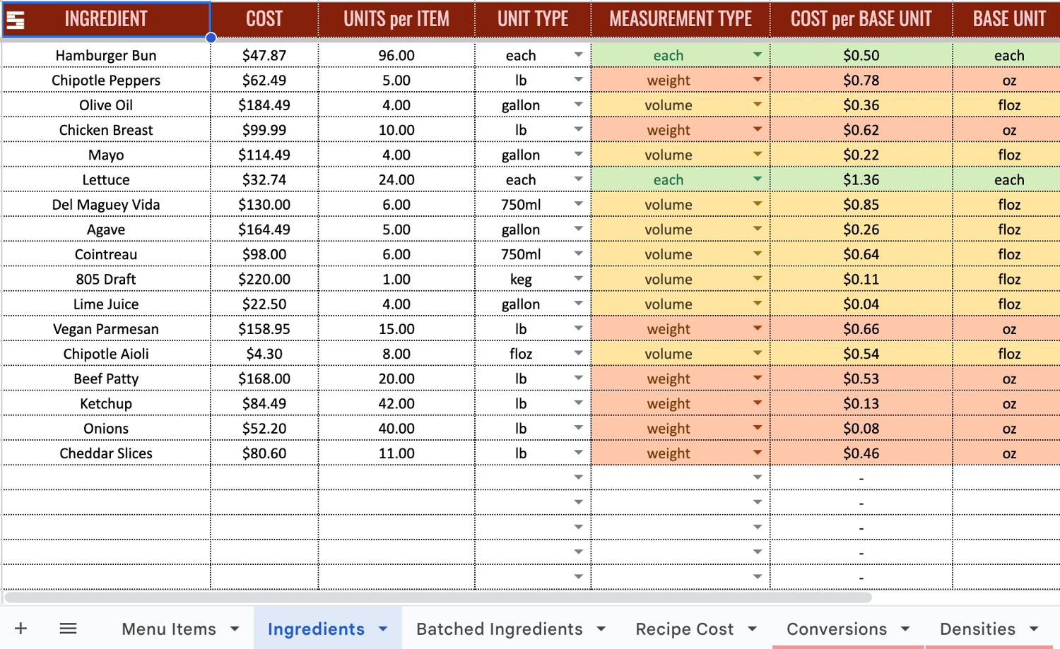 - Enter the bulk purchase (like a 25 lb bag or a gallon of oil), choose the unit you use in recipes (like tbsp, oz, cup, etc.), and the sheet does the math for you. It automatically converts and calculates the true portion cost