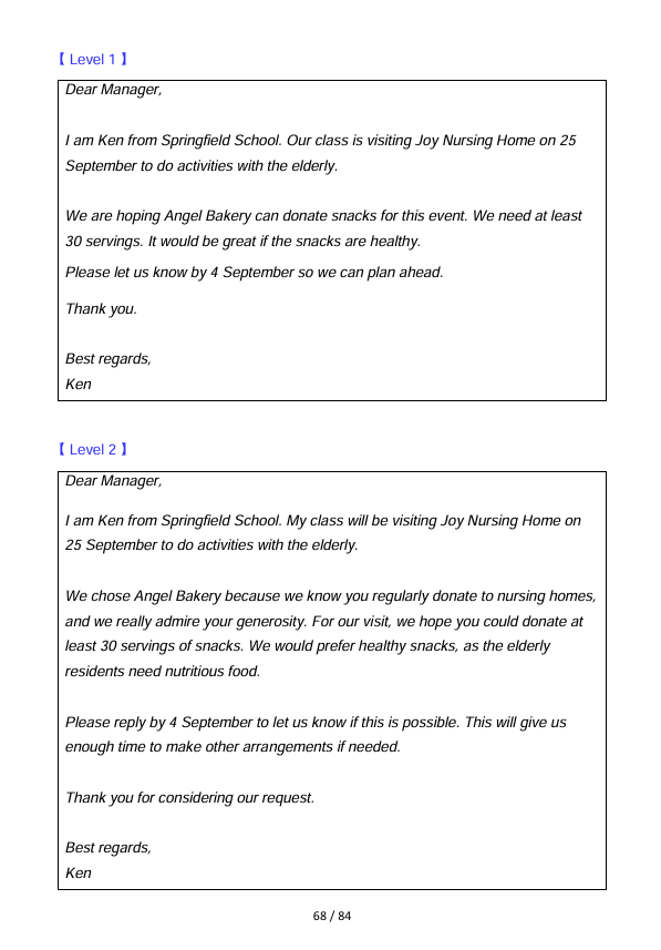 - 【 Level 1 】 represents basic writing, where students rely on simple English and stick closely to the given prompt, showing minimal effort to expand their ideas.