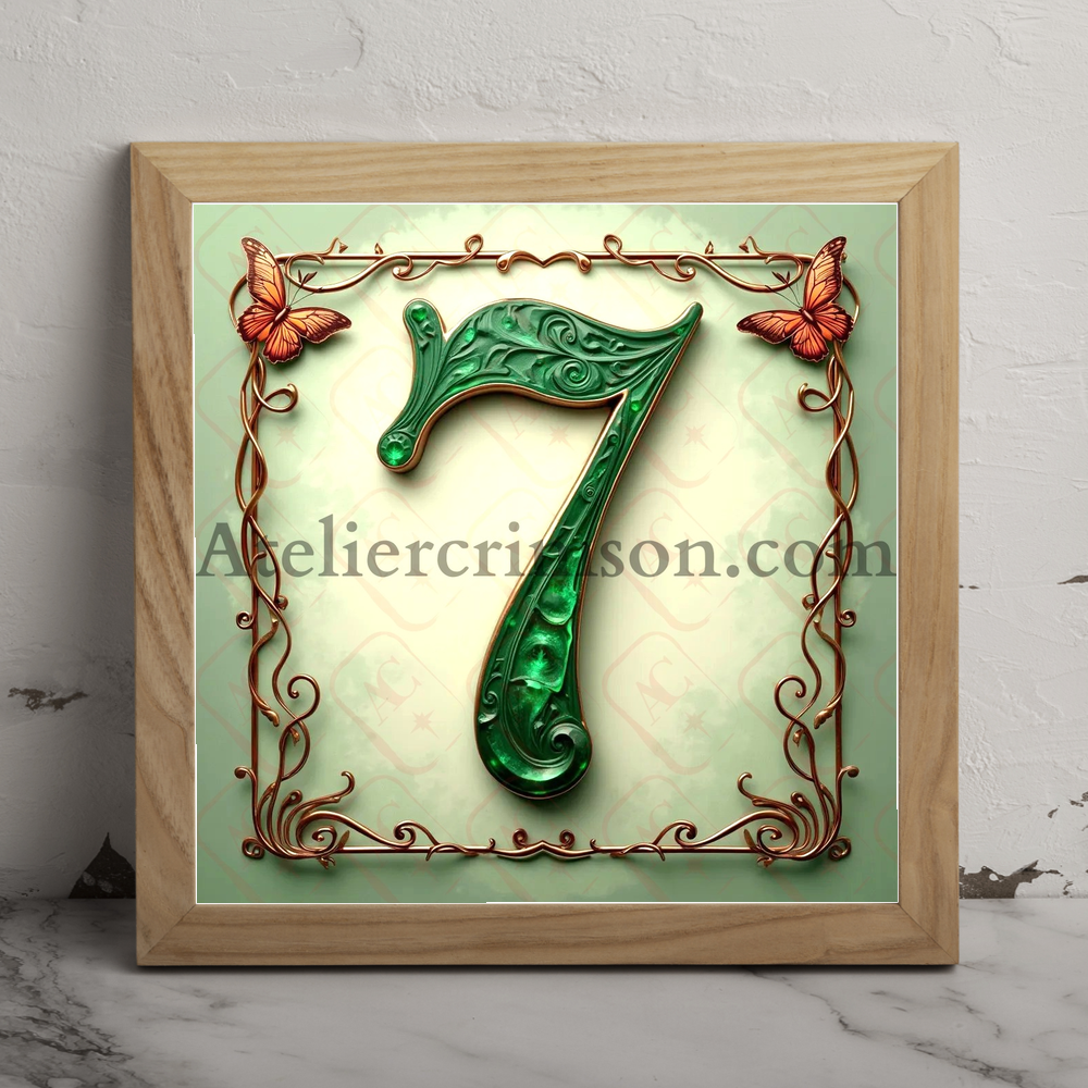 Number 7 emerald and copper Art Nouveau Intricate design with floral patterns, butterflies, and vines. Elegant sage green background. Perfect for vintage lovers and typography enthusiasts.