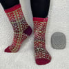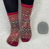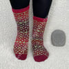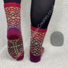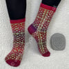 The charted pattern in this sock works well with a solid and a contrasting long gradient yarn (as in the pair pictured), or you could use two contrasting solid colors. Be creative, have fun, but keep in mind changes will affect yardage and number of ends to weave in. The amounts of each color required will depend on how many colors you pick, where you choose to use them in the sock, and which size you are knitting. As a guide for the socks pictured (size M in two colors) I used the following quantities:
