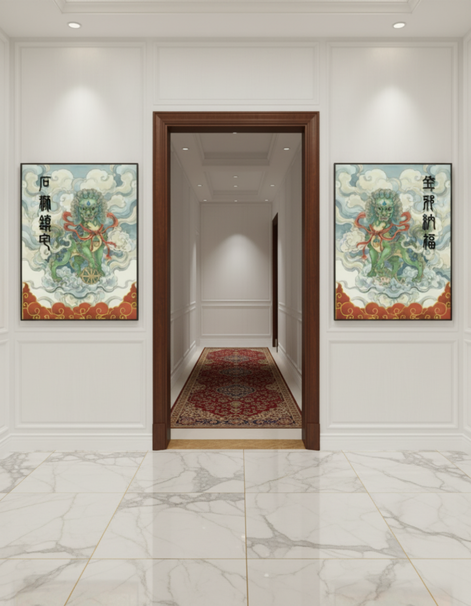 - On a wall facing the entryway so the guardian lions watch over anyone coming in