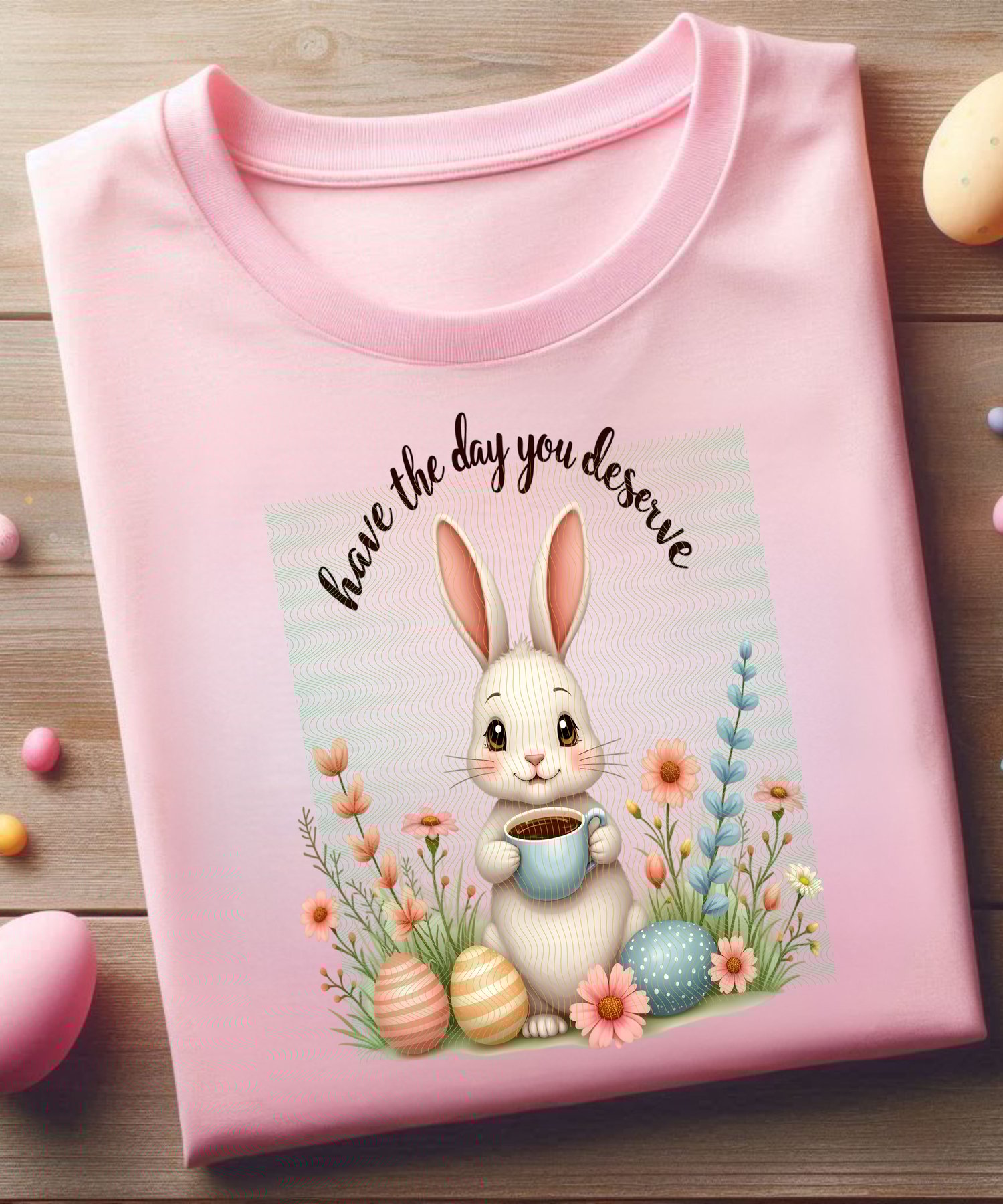 ☕🐰 Start your Easter morning with this cozy bunny! This cute rabbit holds a warm cup of coffee, surrounded by pastel flowers and Easter eggs. A perfect design for coffee lovers and springtime vibes!