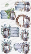 Compositions in rustic style with old kerosene lamp, wooden panels, greneery wreath, cotton wreath, oak wreath