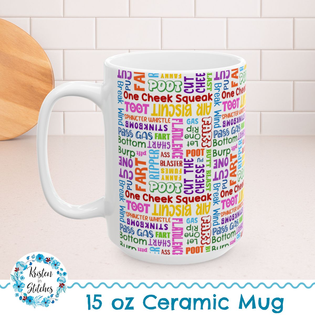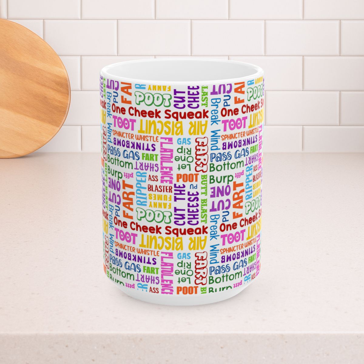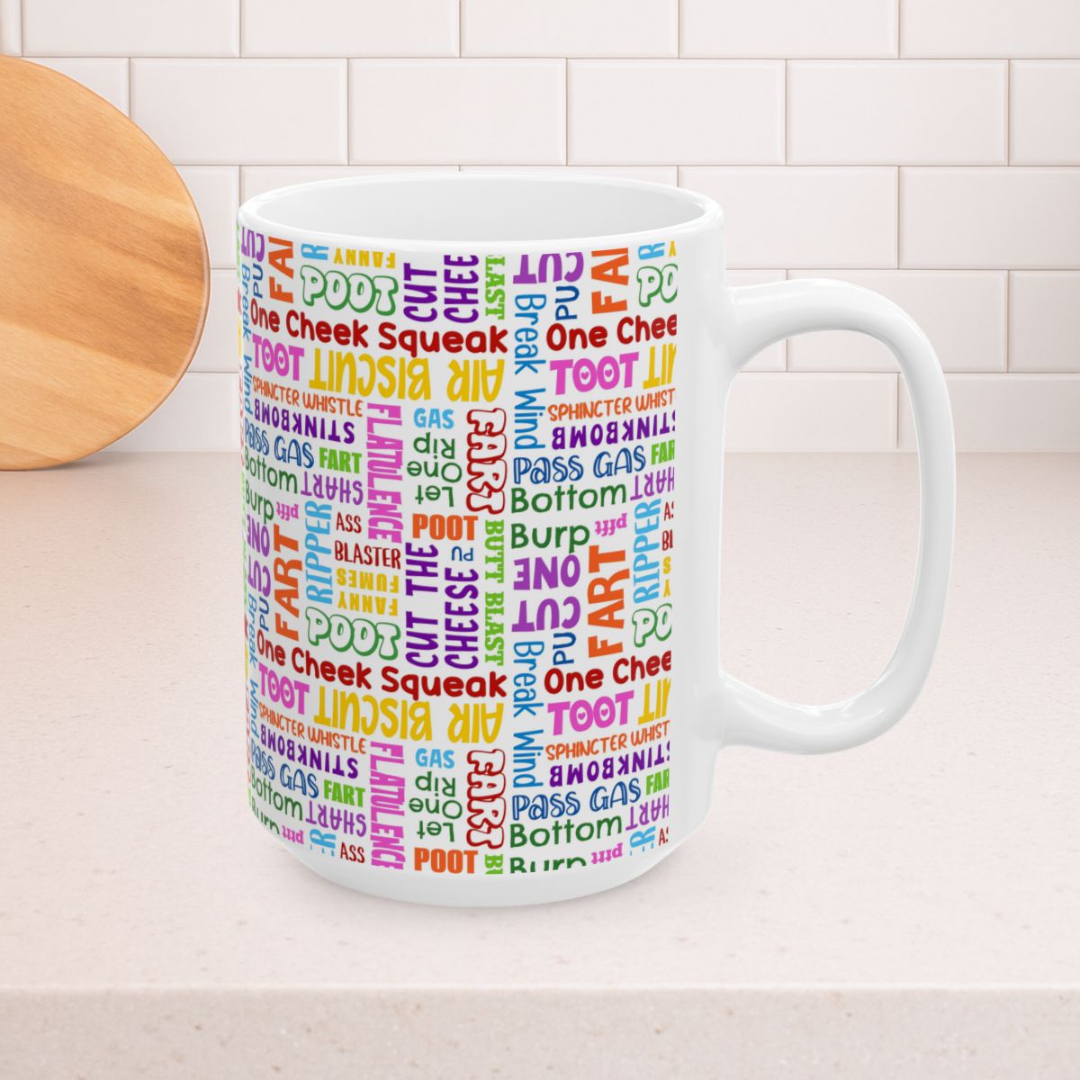 Fart Word Cloud 15oz Ceramic Mug, Large Coffee Cup, Colorful Sarcastic Bathroom Humor