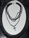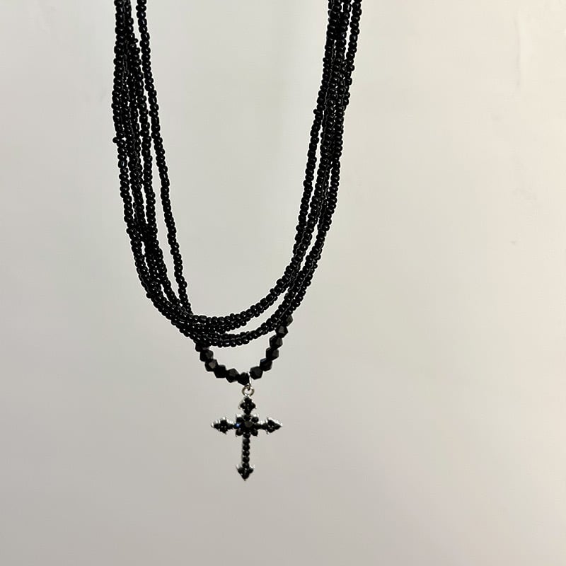 Yes! Completely black! Purely handmade. The beads differ in size, and the pendant of the cross in the middle is large enough to bring visual flow. The rhythm brought by the multi layering makes this restrained and minimal necklace never monotonous.