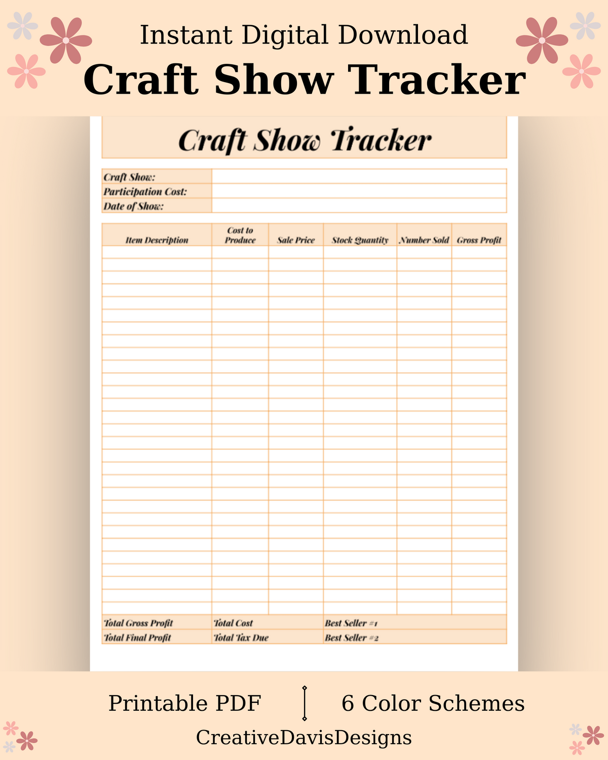 Use this craft show tracker printable to keep track of your sales at craft shows you attend. Helps keep you organized. With this tracker you can put the name of the show, the date and the amount paid to attend the show. You'll be able to track the cost of the item, price, what you have in stock and what you've sold as well as your gross profit on each item.