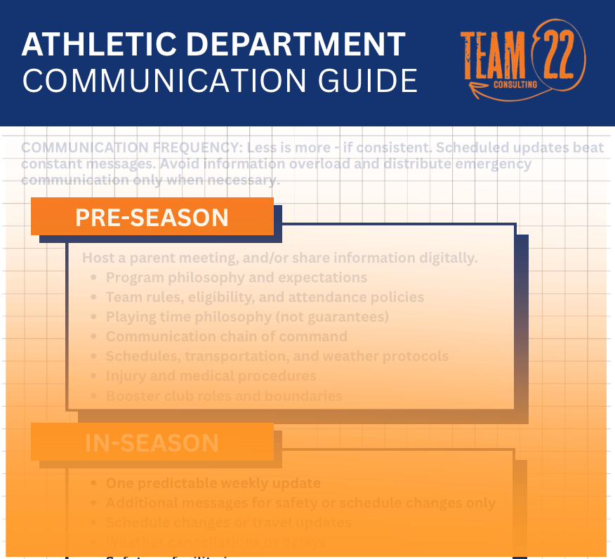 A roadmap for leading through proactive communication, this guide provides timelines and best practices for middle school-high school, that an Athletic Director can use to establish and maintain credibility, set the tone for the culture of the program, and build and grow positive, productive relationships. When communication among coaches, student-athletes and families is timely, consistent and reliable, expectations are clear and conflicts are minimal.