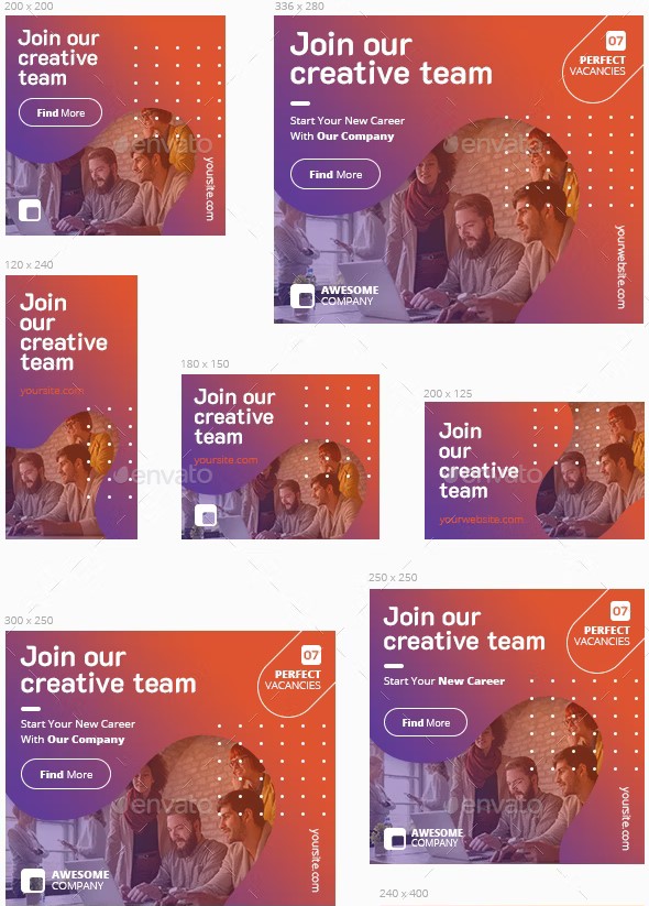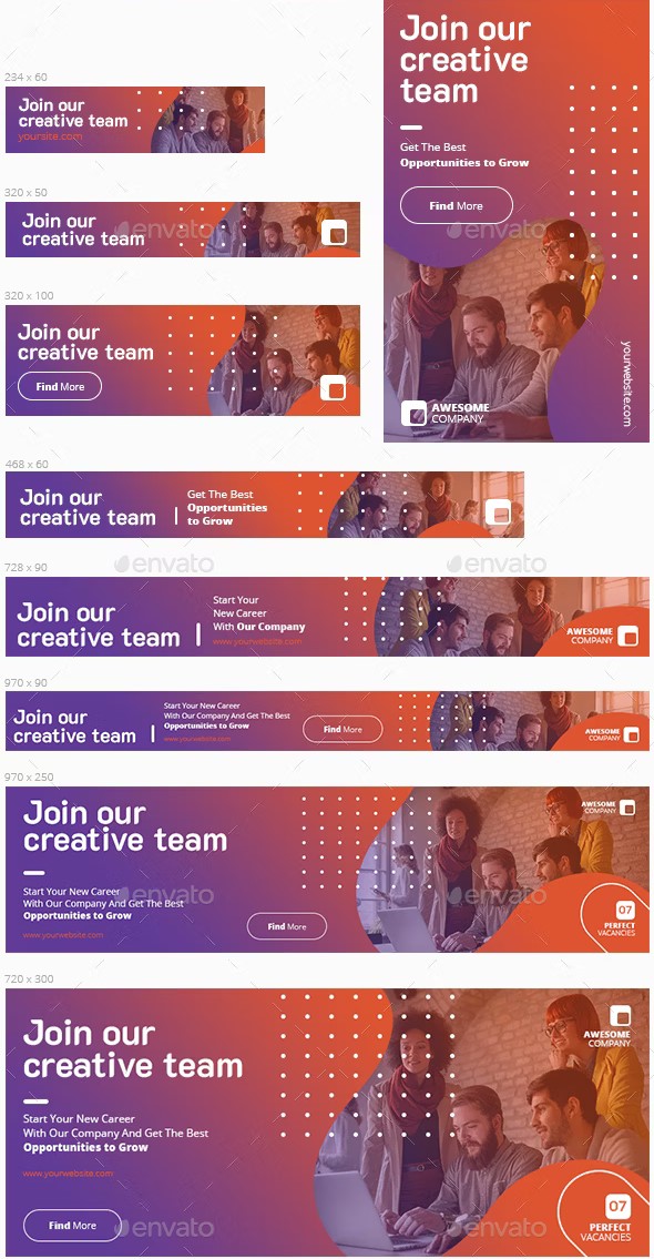22 different sizes Multipurpose Web Banners for presenting any kind of Your Business services. You will get fully editable, well organized, named and grouped 22 PSD files and a help file that will step by step guide you to add your own image easily using smart objects. The image is for preview only and is not included in download.