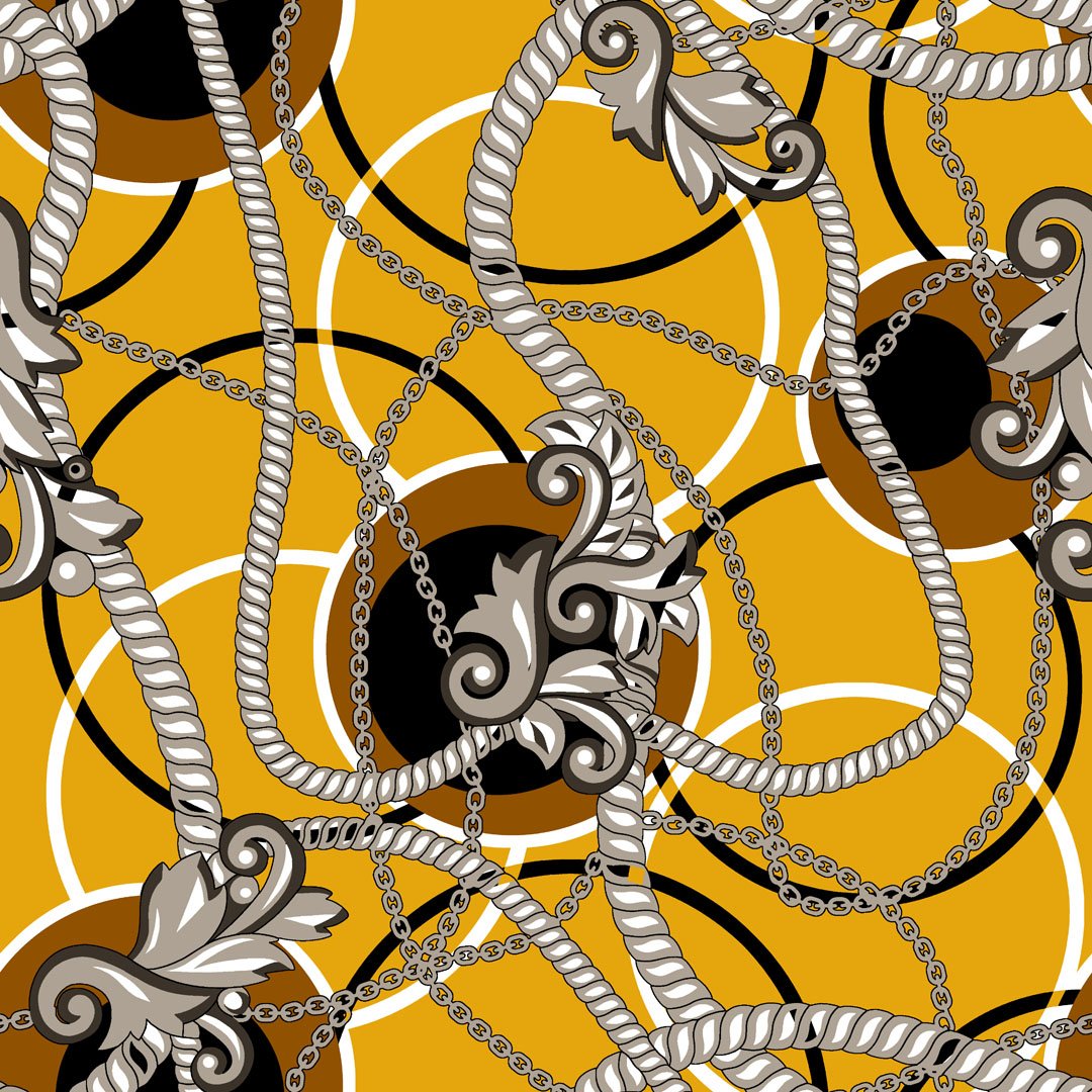 Luxury chain and baroque scrolls on mustard geometric base.